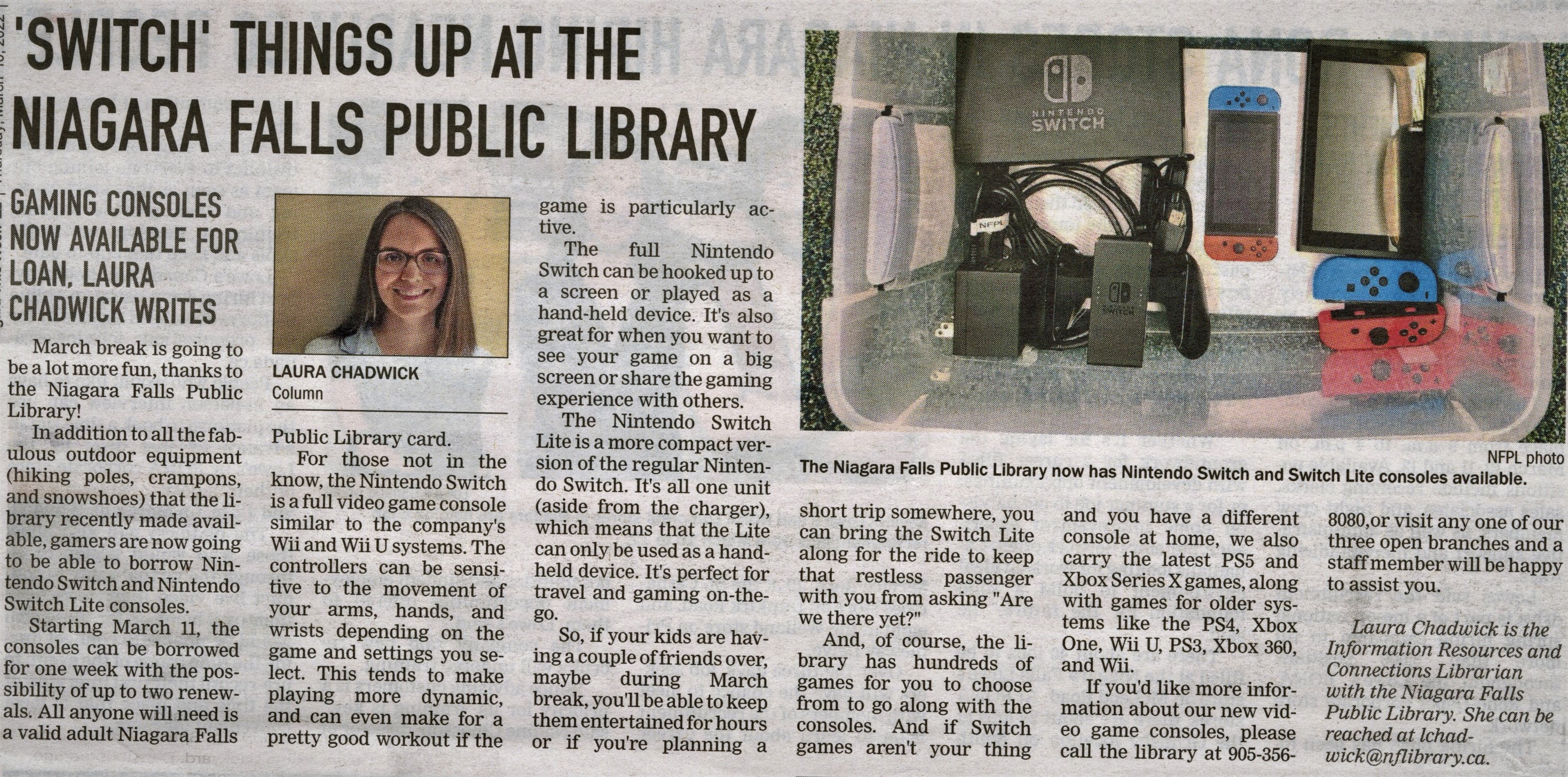 - 'Switch' things up at the Niagara Falls Public Library : Gaming consoles now available for loan Laura Chadwick writes