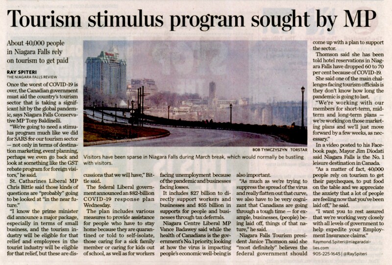 - Tourism stimulus program sought by MP : about 40,000 people in Niagara Falls rely on tourism to get paid