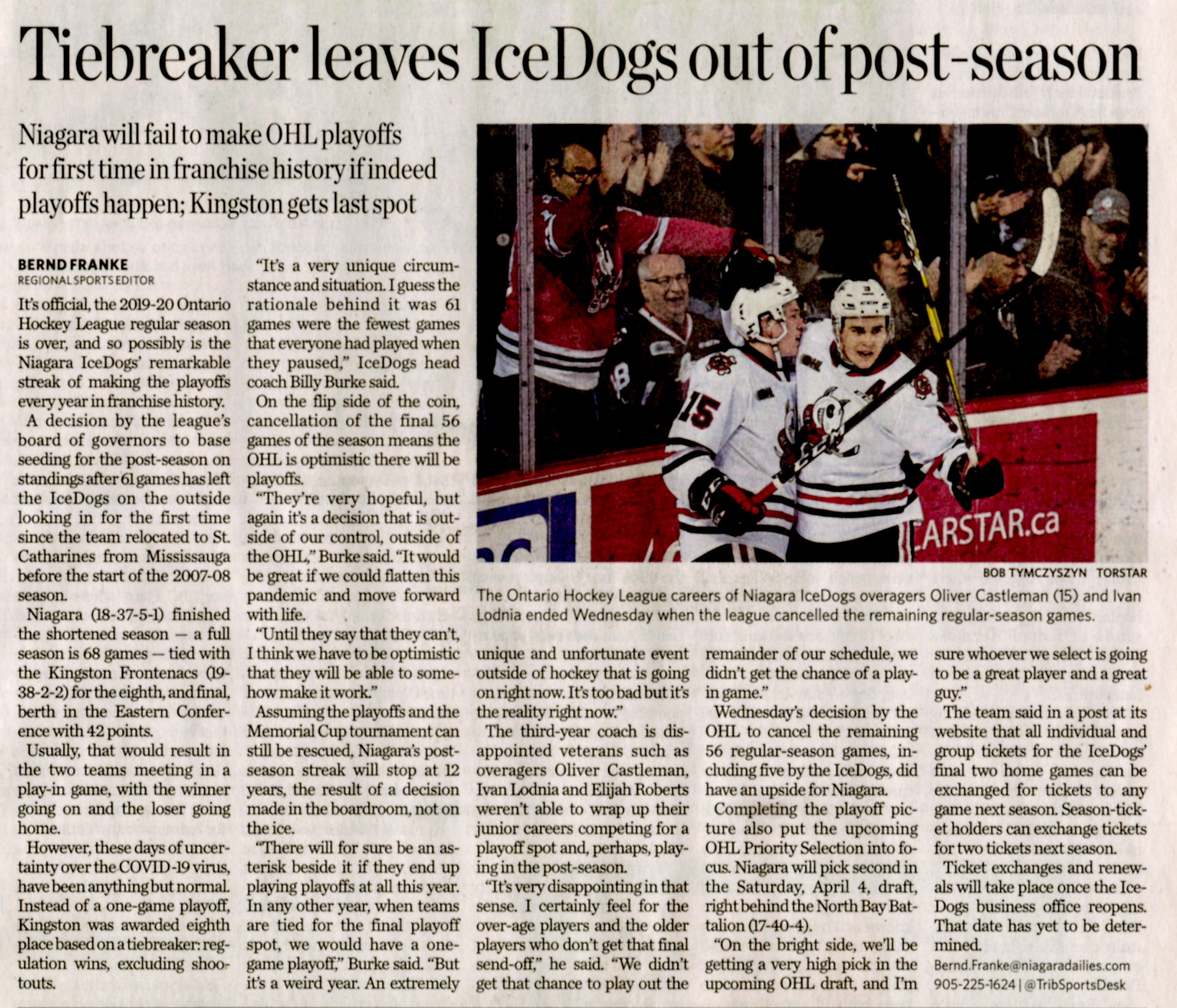 - Tiebreaker leaves IceDogs out of post-season : Niagara will fail to make OHL playoffs for tirst time in franchise history if indeed playoffs happen : Kingston gets last spot