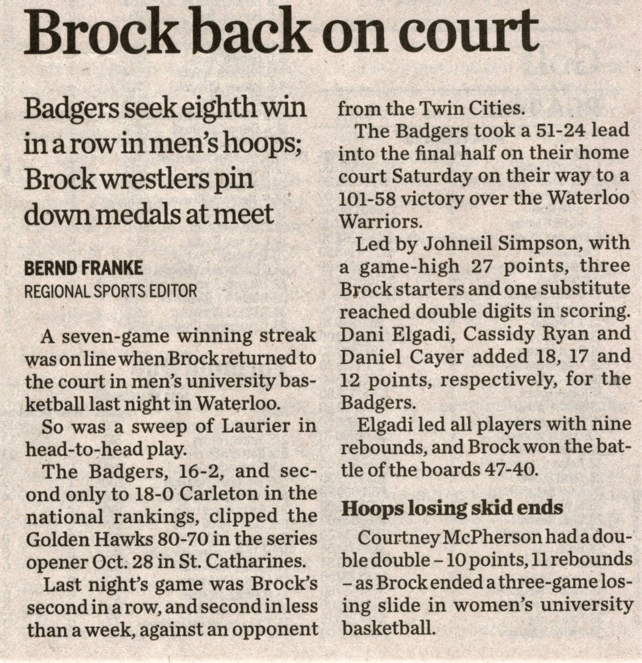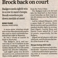 - Brock back on court : Badgers seek eighth win in a row in men's hoops : Brock wrestlers pin down medals at meet