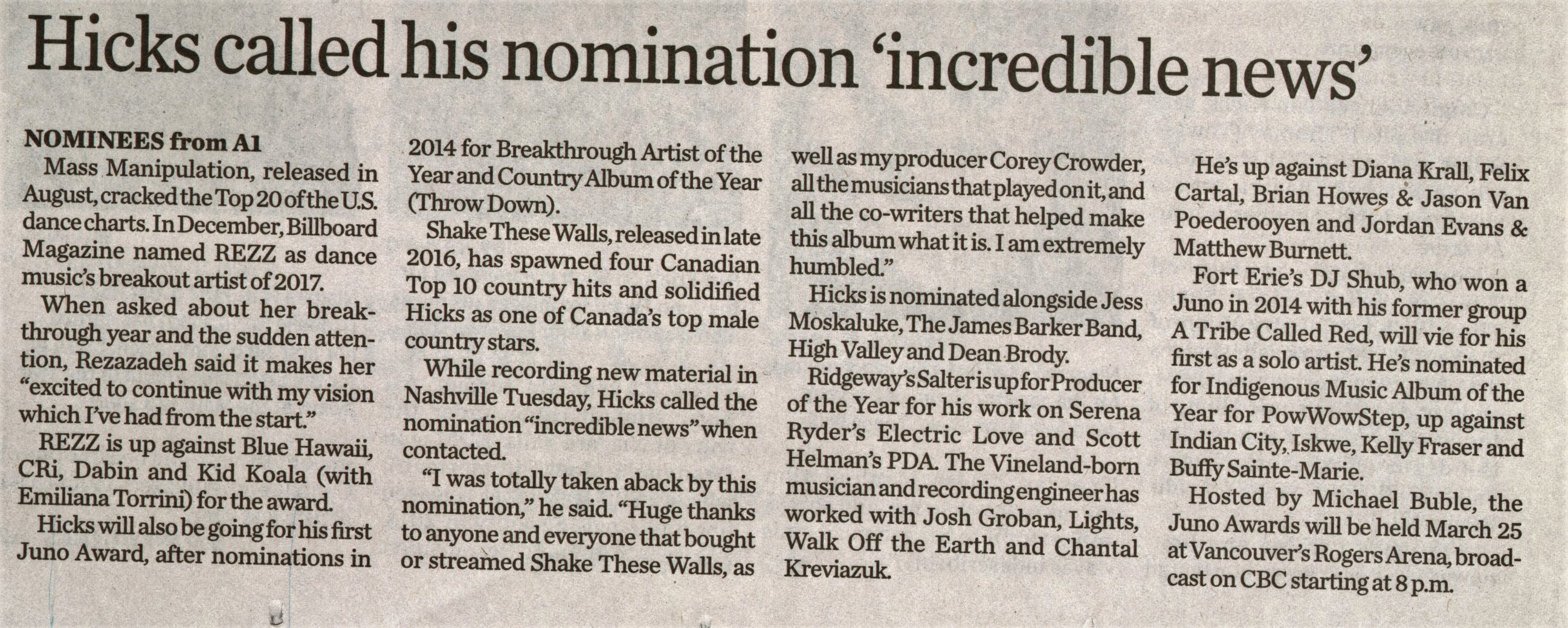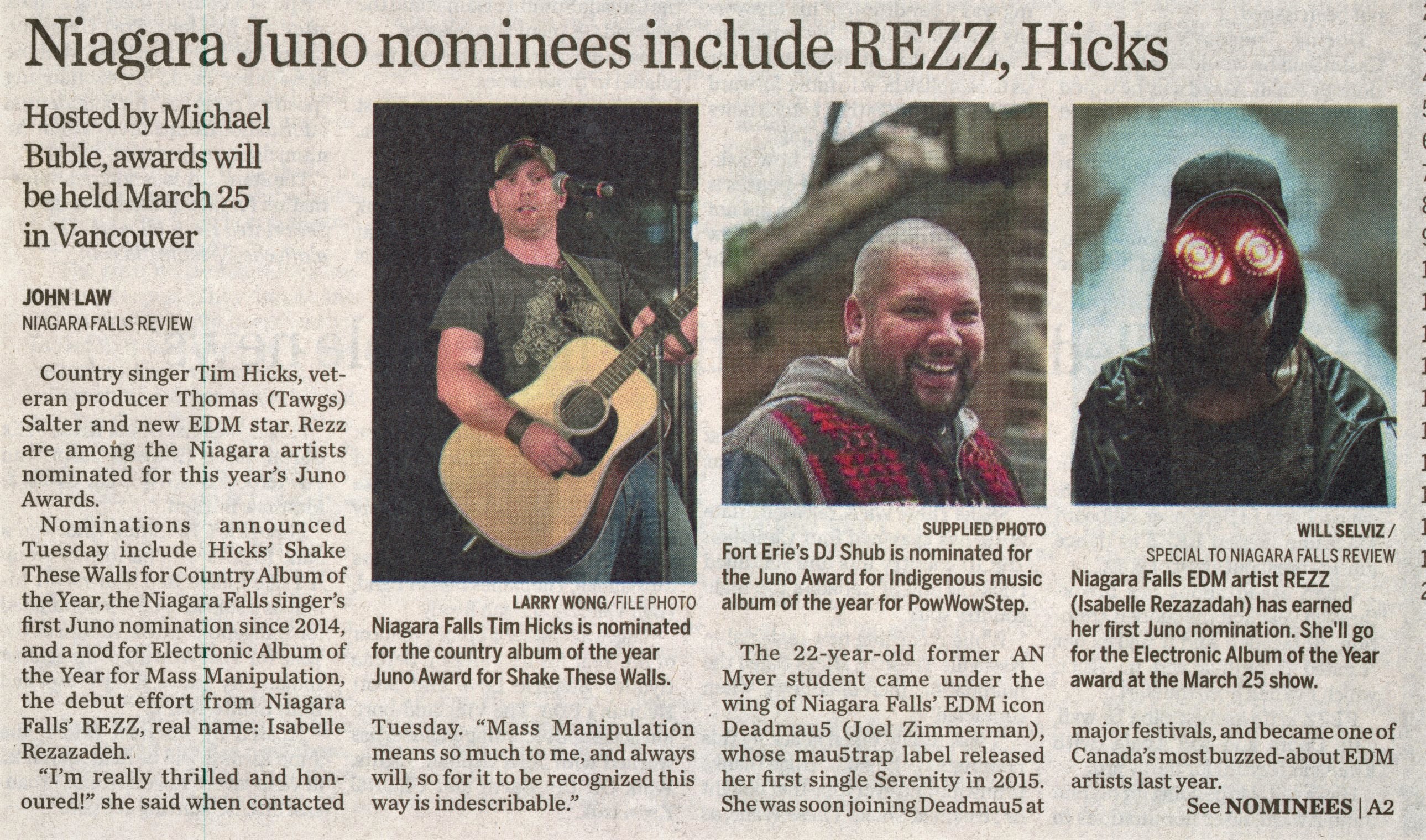 - Niagara Juno nominees include REZZ, Hicks : hosted by Michael Buble, awards will be held March 25 in Vancouver