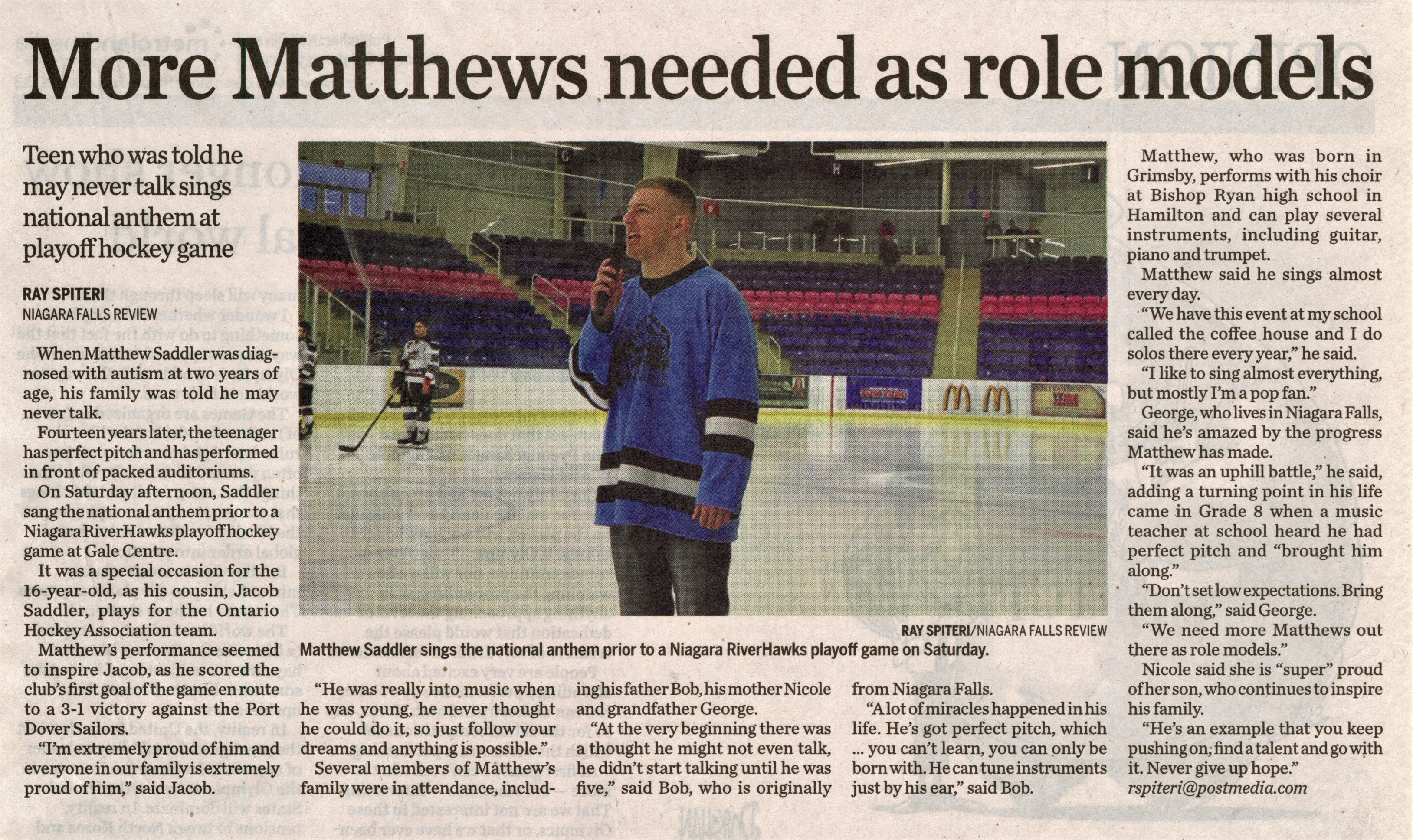 - More Matthews needed as role models : teen who was told he may never talk sings national anthem at playoff hockey game