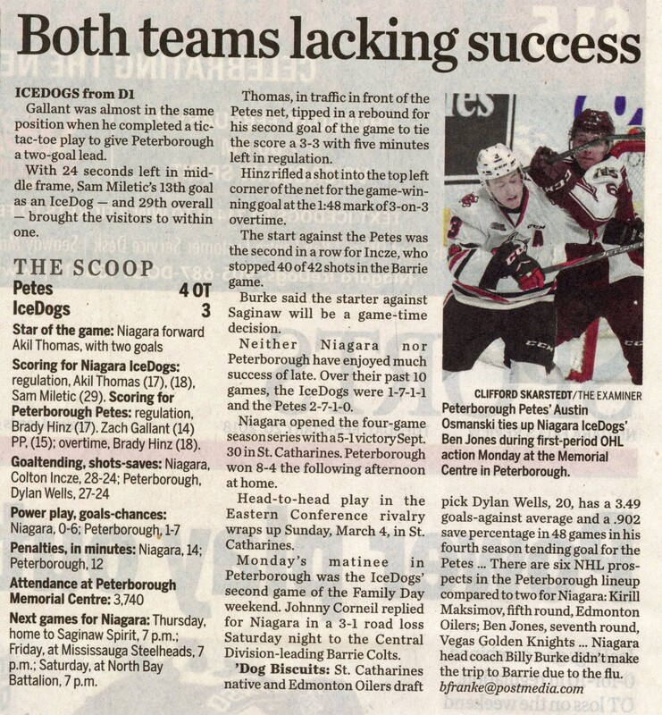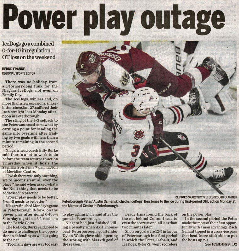 - Power play outage : IceDogs go a combined 0-for-10 in regulation, OT loss on the weekend