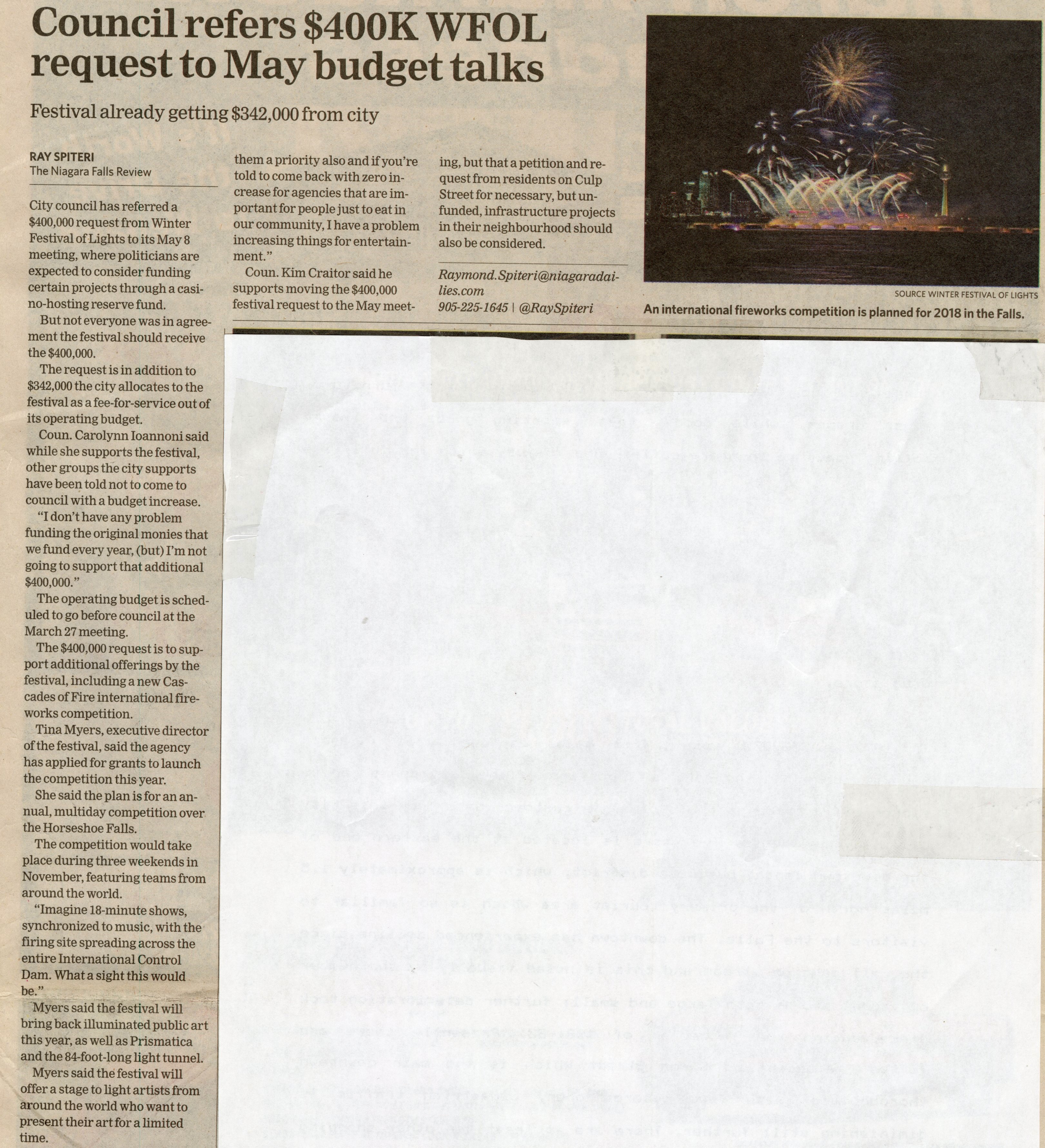 - Council refers $400K WFOL request to May budget talks : Festival already getting $342,000 from city