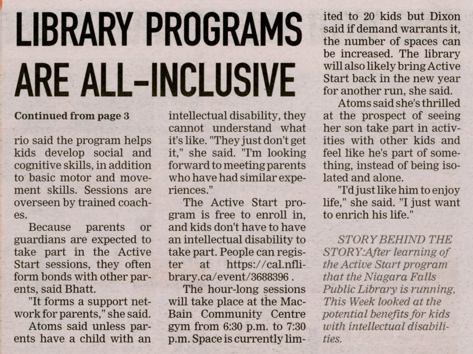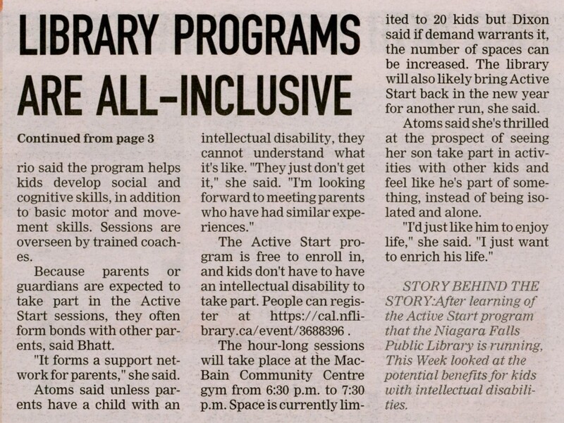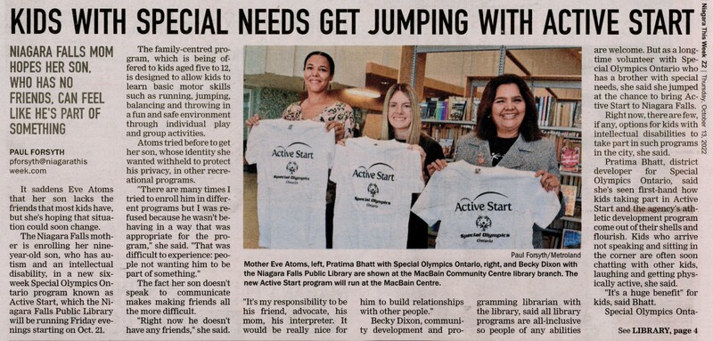 - Active Start / Niagara Falls Public Library / Dixon, Becky / Bhatt, Pratima / Special Olympics Ontario / Atoms, Eve / MacBain Community Centre