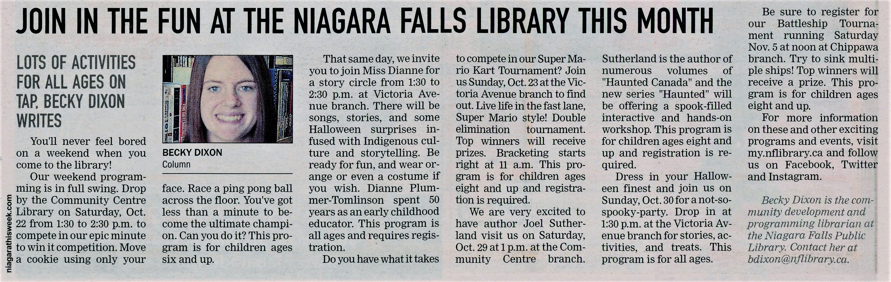 - Join in the fun at the Niagara Falls Library this month : Lots of activities for all ages on tap