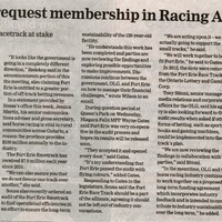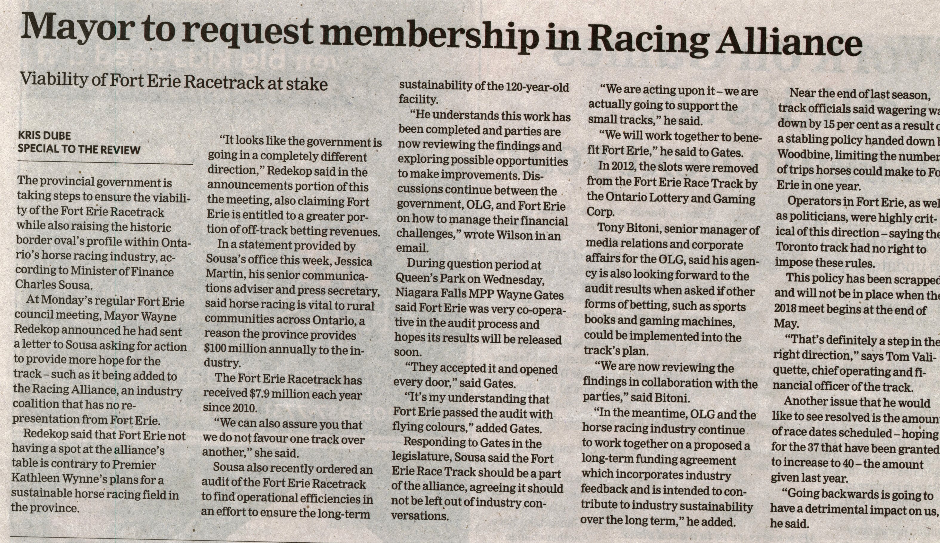 Mayor to request membership in Racing Alliance : viability of Fort Erie Racetrack at stake