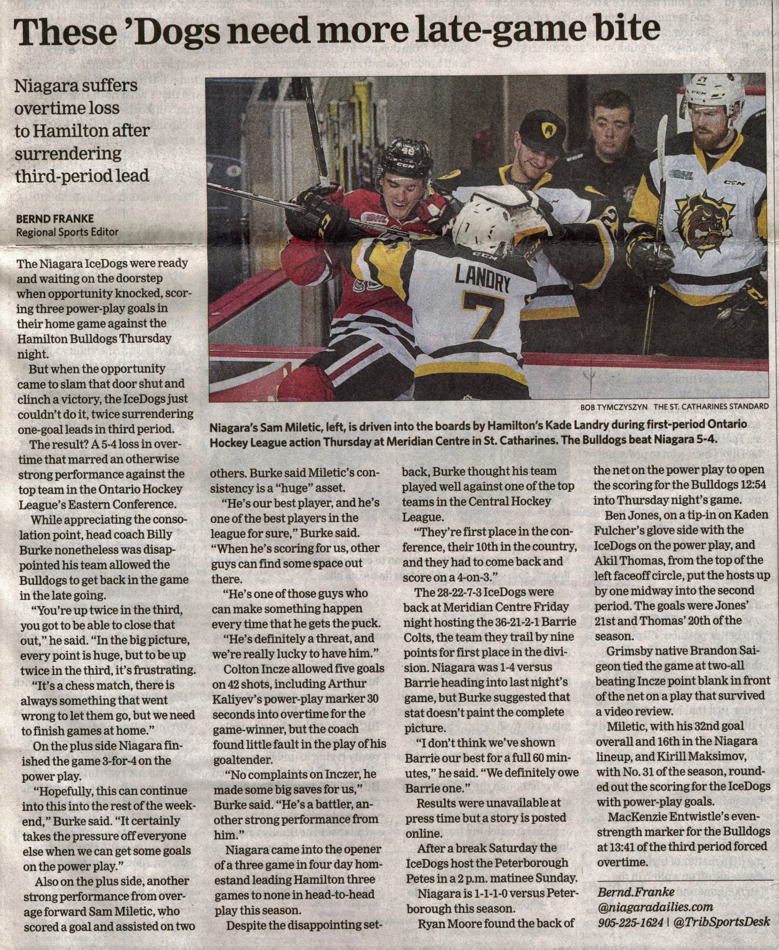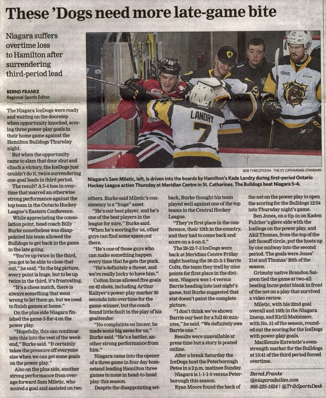 - These Dogs need more late-game bite : Niagara suffers overtime loss to Hamilton after surrendering third-period lead