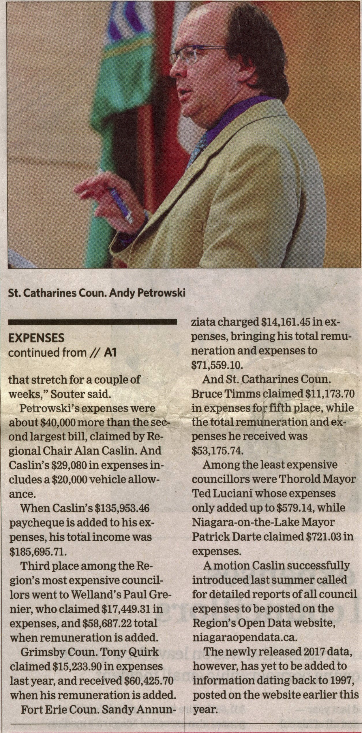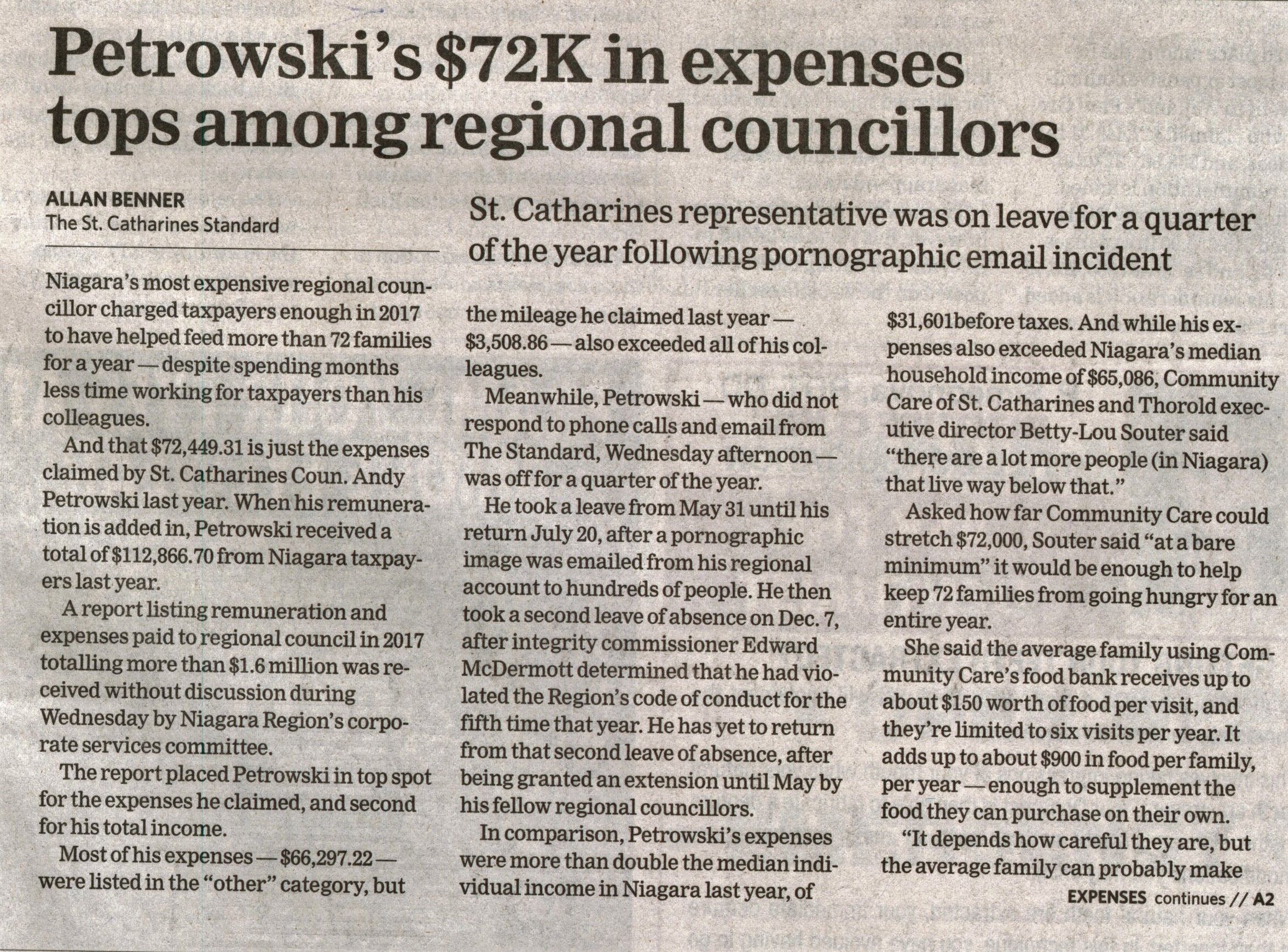 - Petrowski's $72K in expenses tops among regional councillors : St. Catharines representative was on leave for a quarter of the year following pornographic email incident