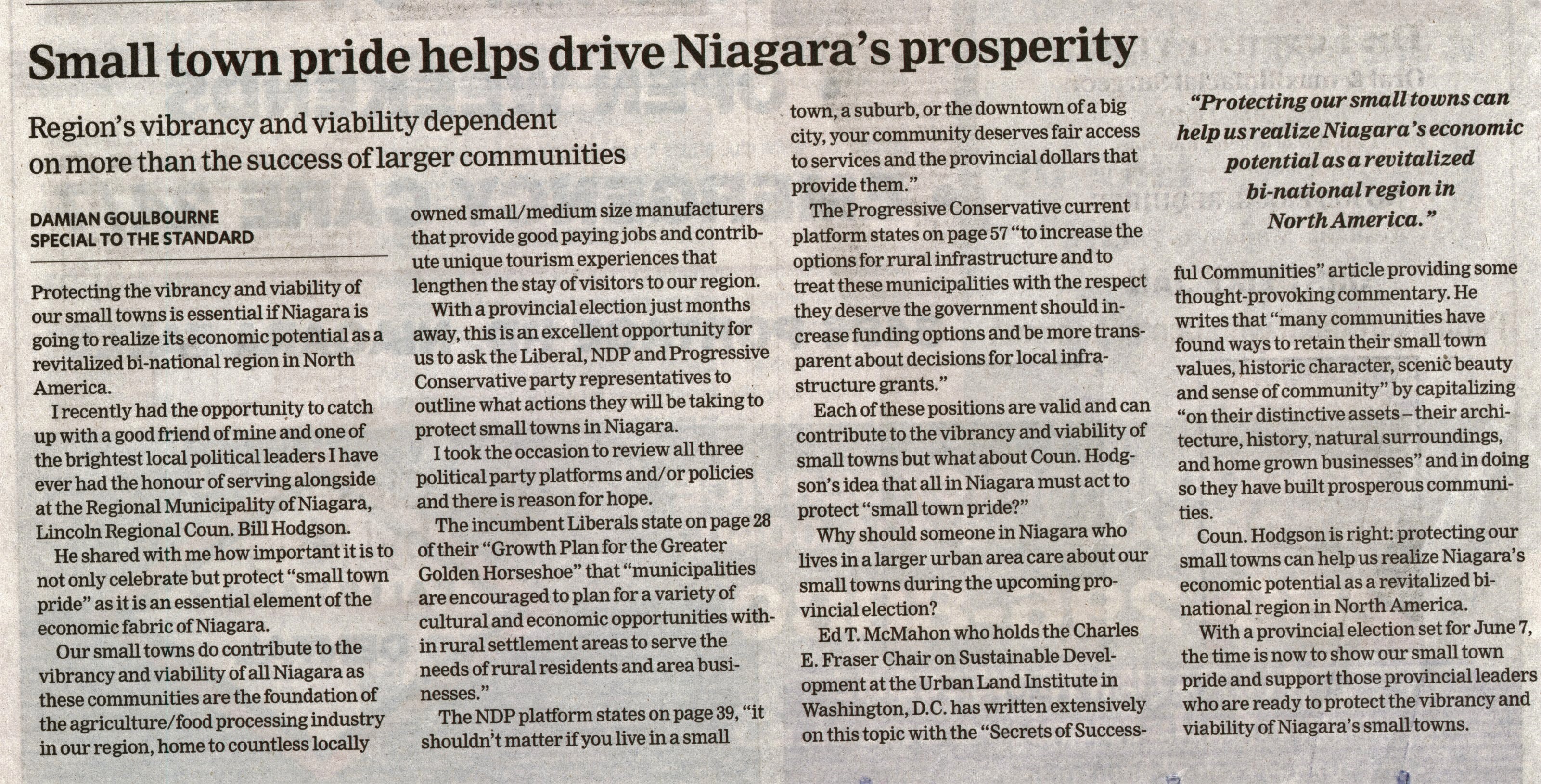 - Small town pride helps drive Niagara's prosperity : region's vibrancy and viability dependent on more than the success of larger communities