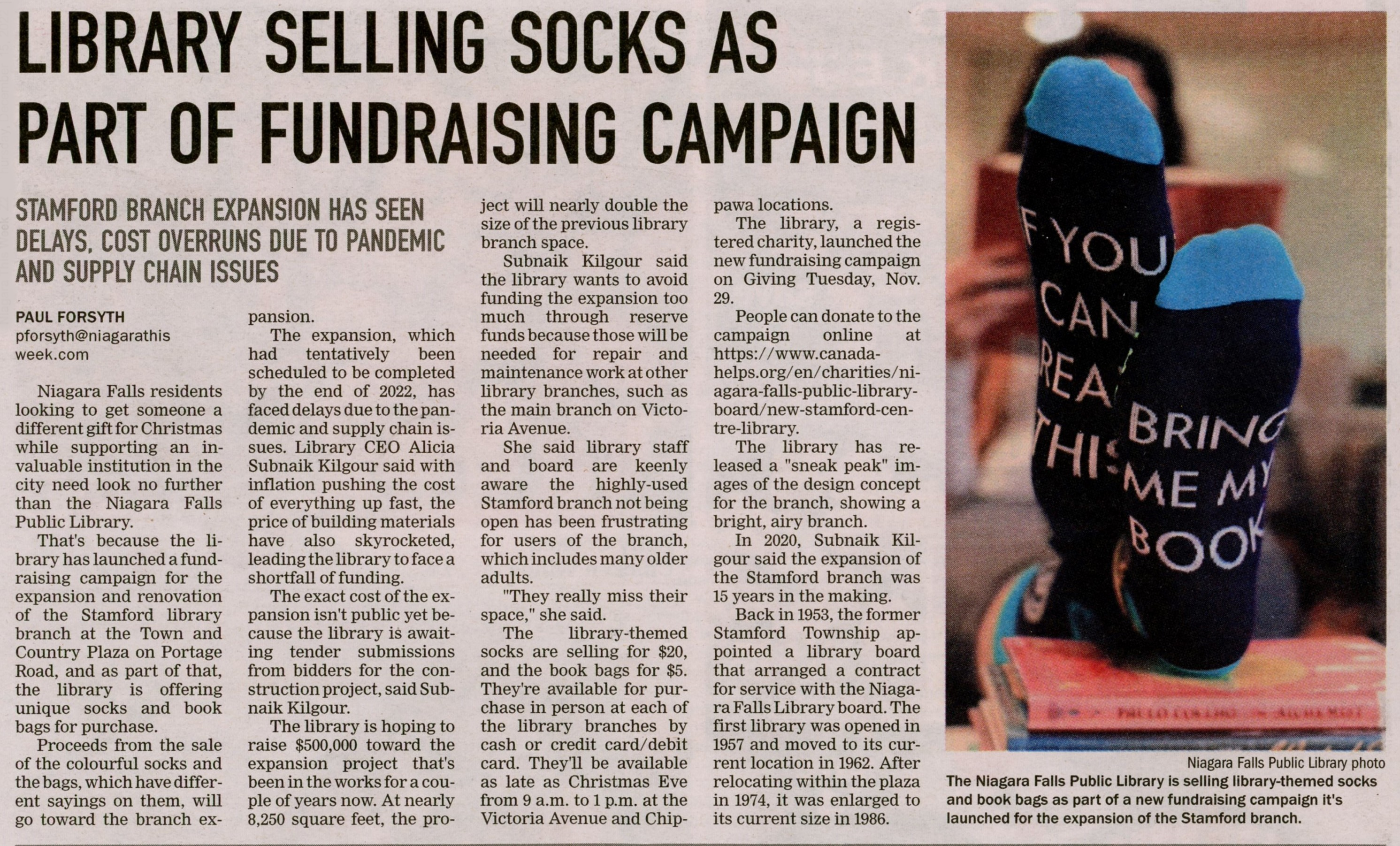- Niagara Falls Public Library / Stamford Branch / renovations / socks / book bags / fundraising