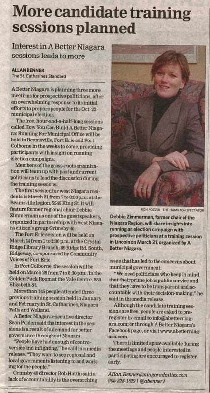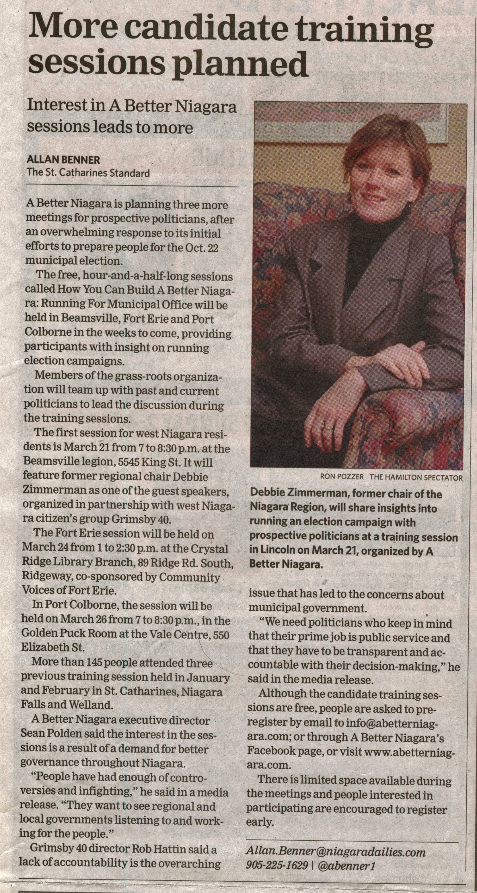 - More candidate training sessions planned : interest in A Better Niagara sessions leads to more