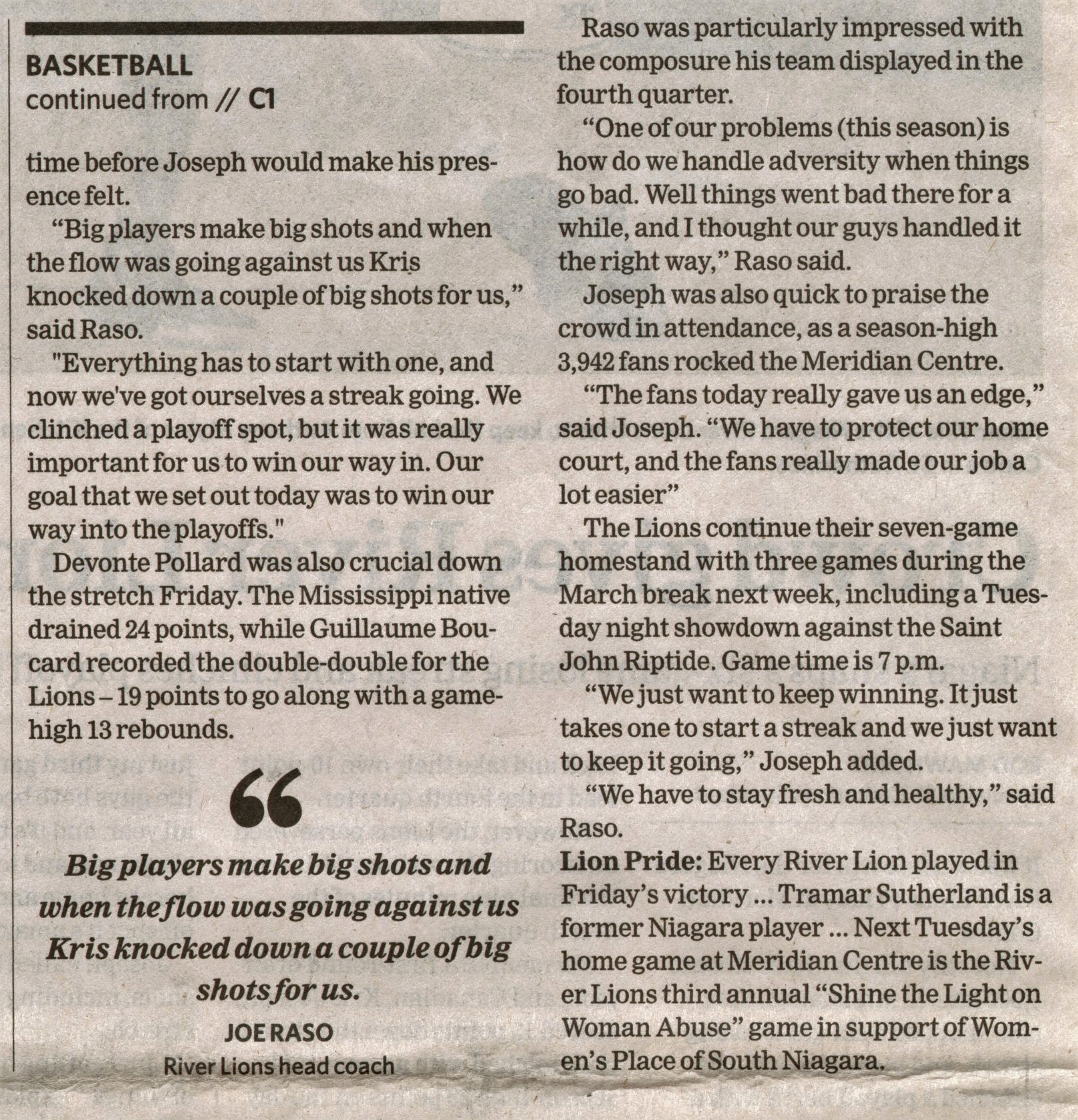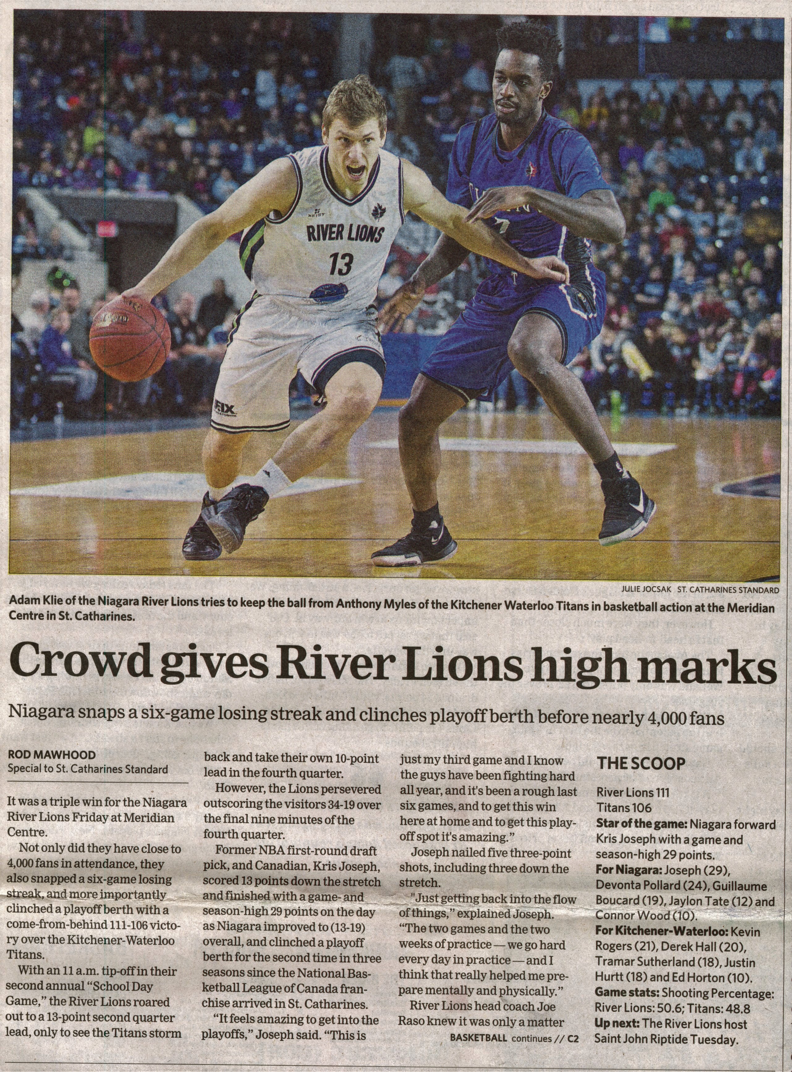 - Crowd gives River Lions high marks : Niagara snaps a six-game losing streak and clinches playoff berth before nearly 4,000 fans