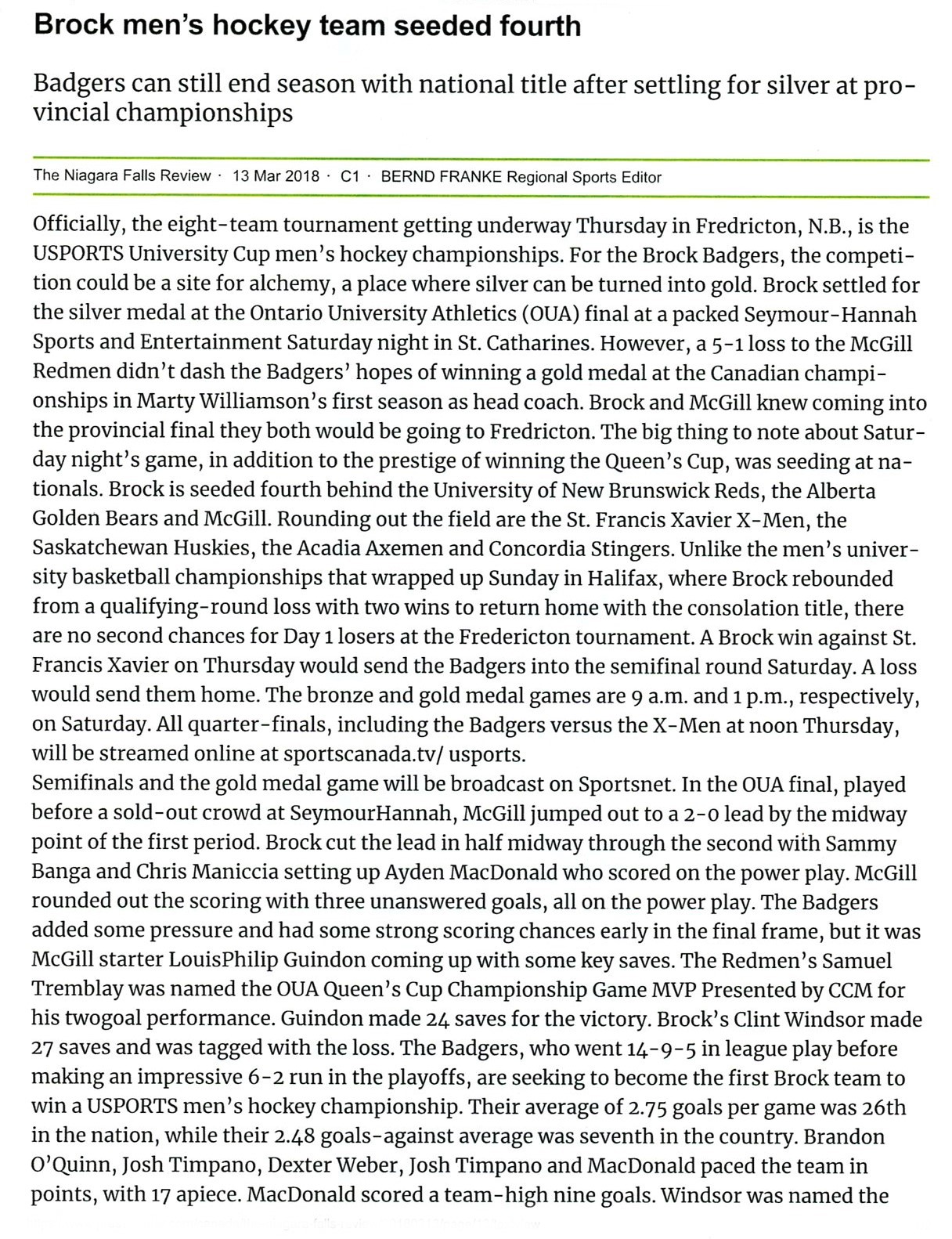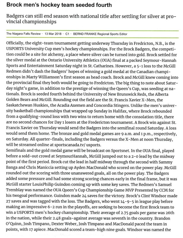 - Brock men's hockey team seeded fourth : Badgers can still end season with national title after settling for silver at provincial championships