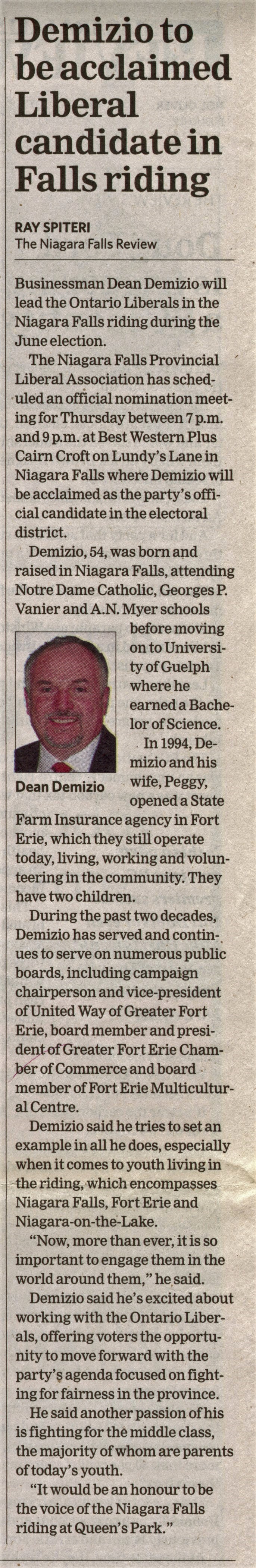 - Demizio to be acclaimed Liberal candidate in Falls riding