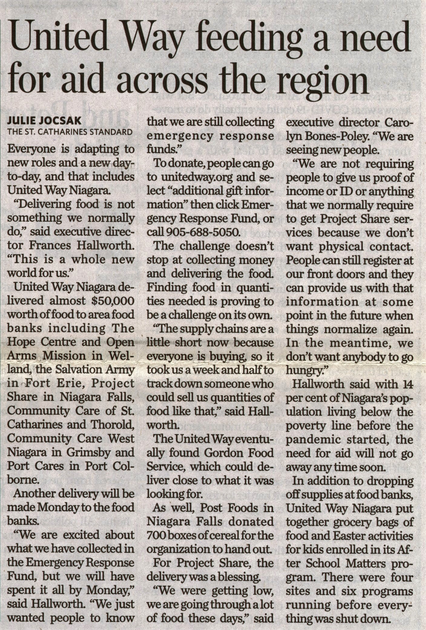 - United Way Niagara / Hallworth, Frances / food delivery / Project Share / Emergency Response Fund / COVID-19 pandemic