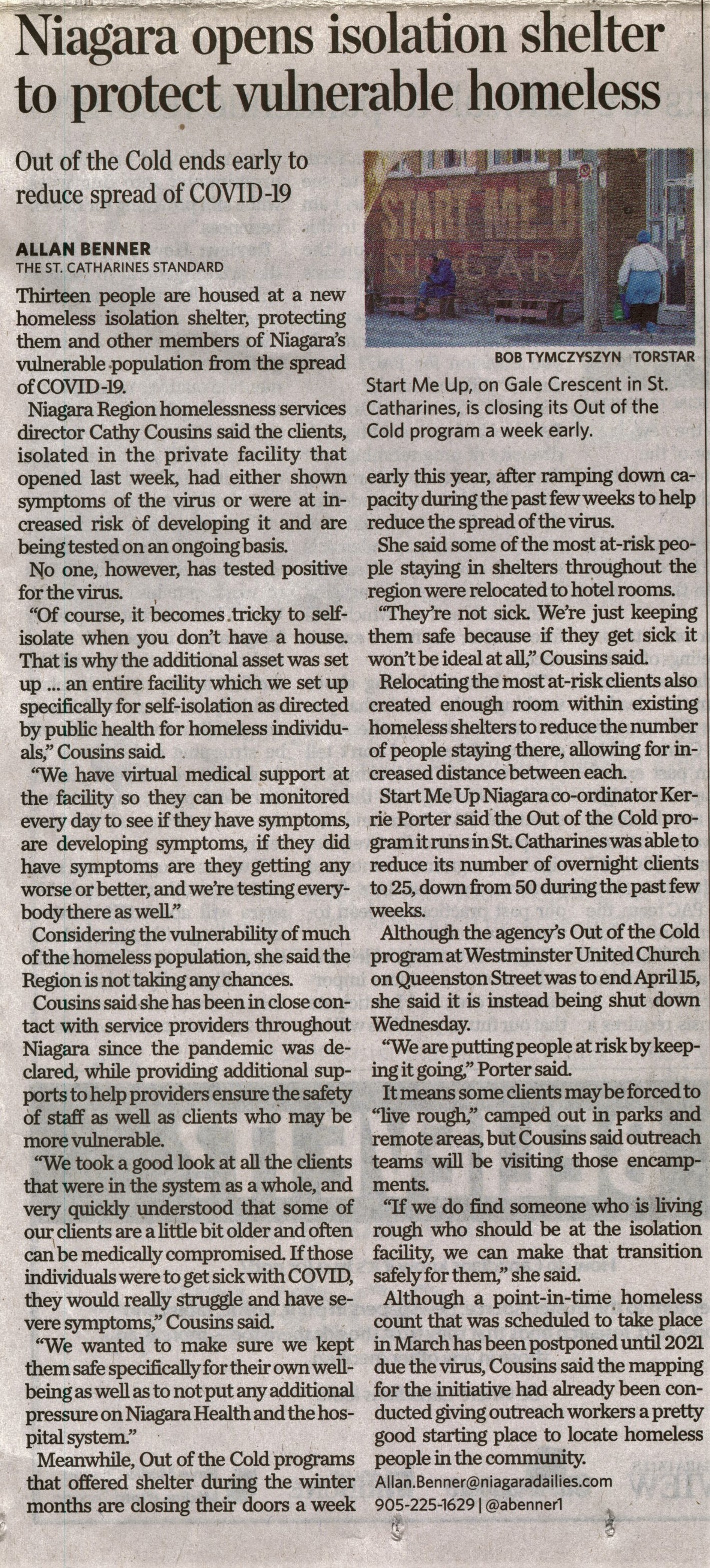 - Start Me Up Niagara / Porter Kerrie / Cousins, Cathy / Niagara Region Homeless Services / Out of the Cold / COVID-19 pandemic