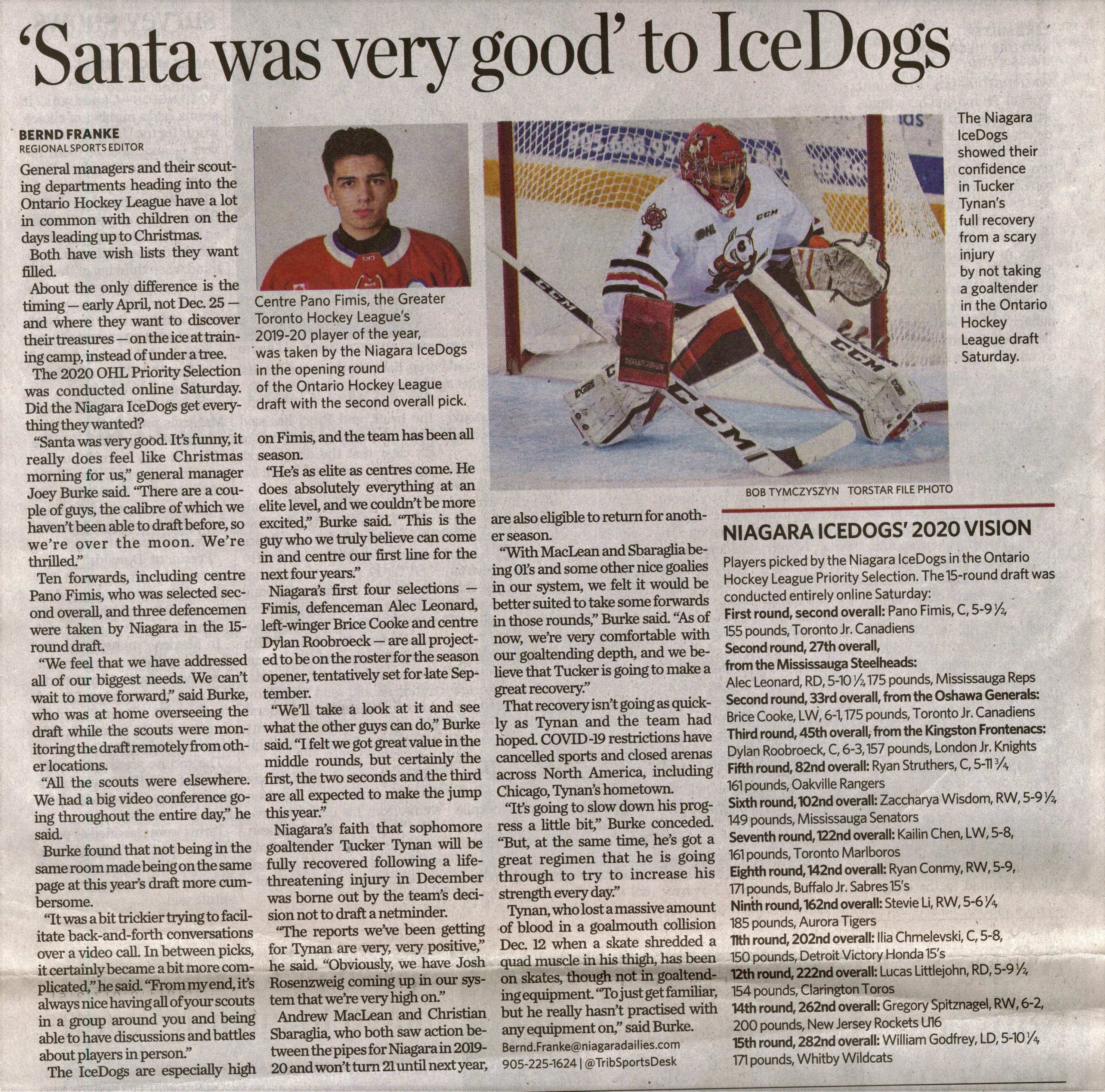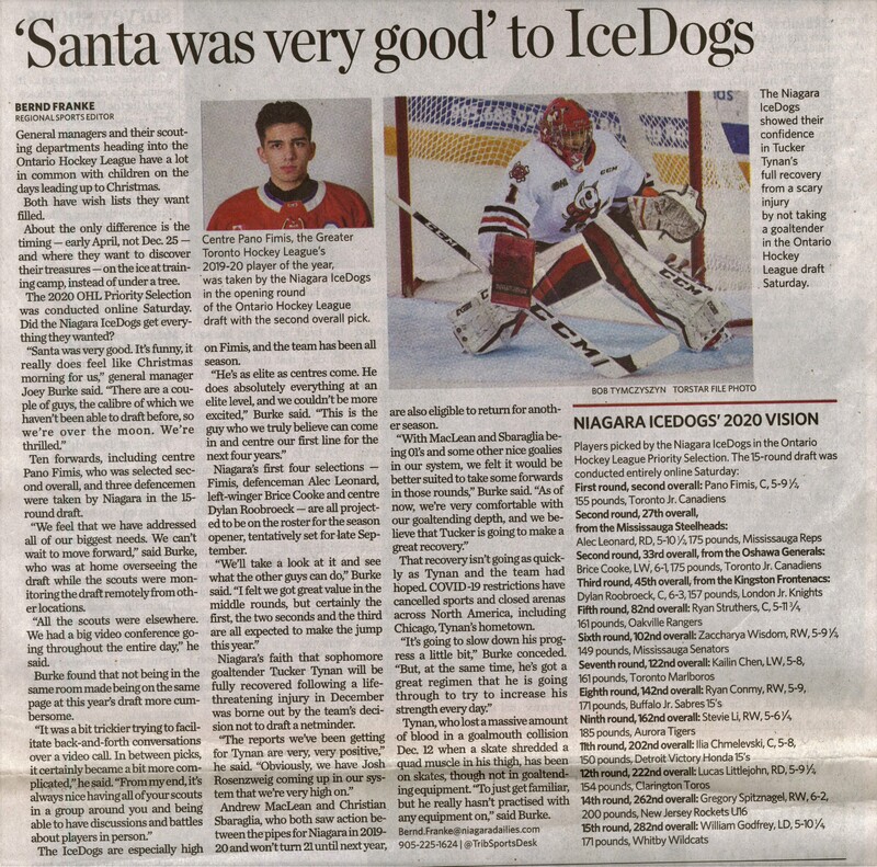 - Niagara IceDogs / Ontario Hockey League draft / Fimis, Pan / Tynan, Tucker / injury COVID-19 pandemic