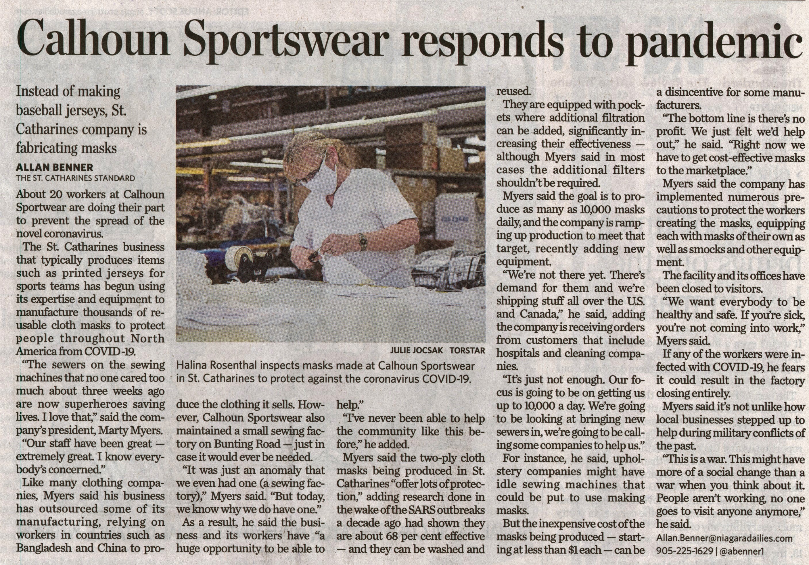 - Calhoun Sportswear responds to pandemic : Instead of making baseball jerseys, St. Catharines company is fabricating masks
