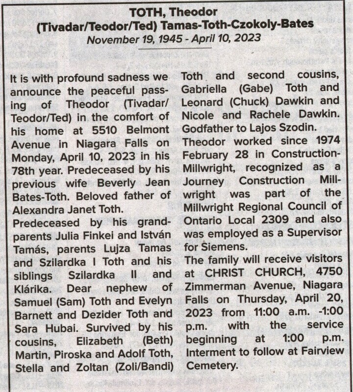 - Toth, Theodor (Tivadar/Teodor/Ted) (Tamas-Toth-Czokoly-Bates)