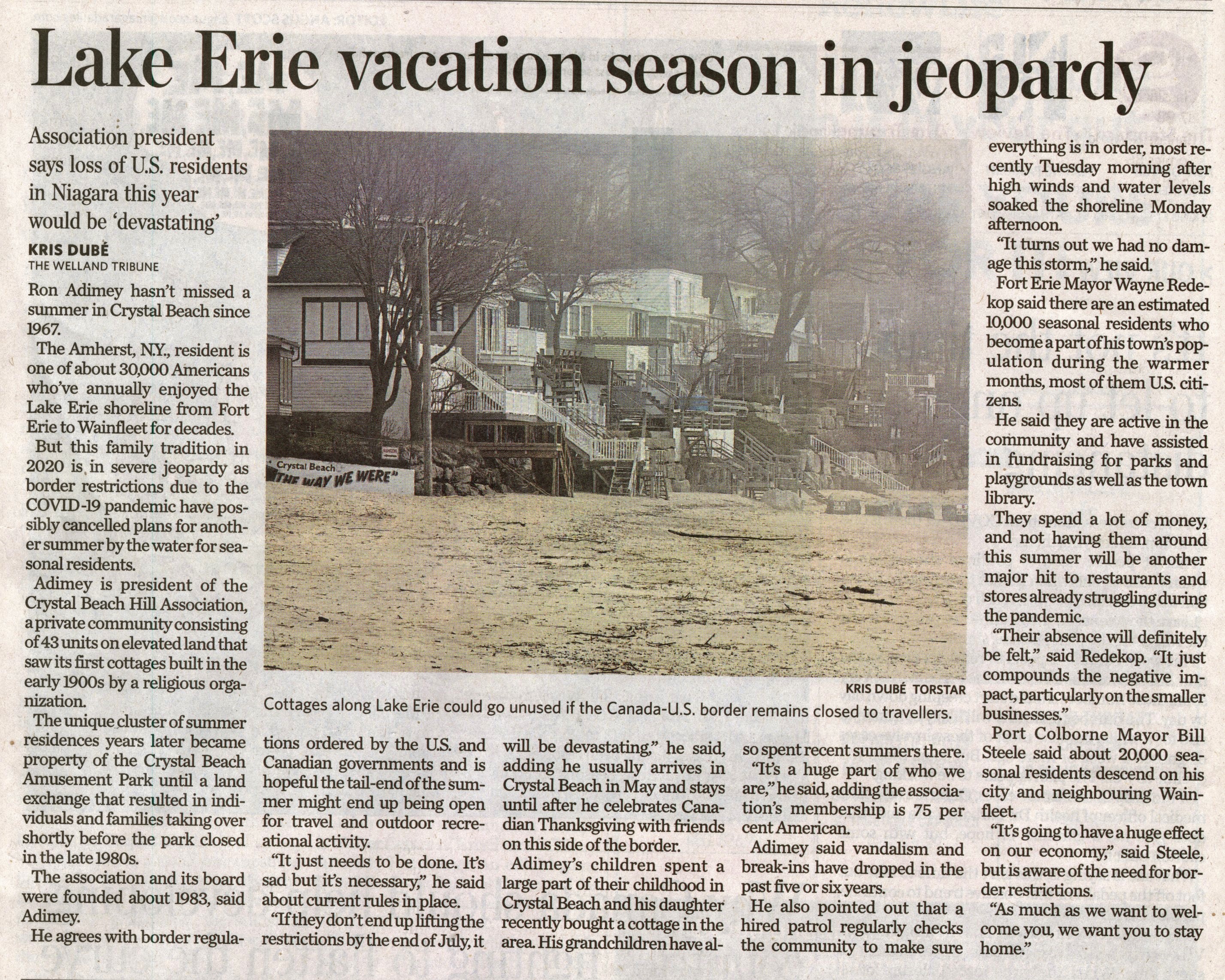 - Lake Erie vacation season in jeopardy : Association president says loss of U.S. residents in Niagara this year would be devastating