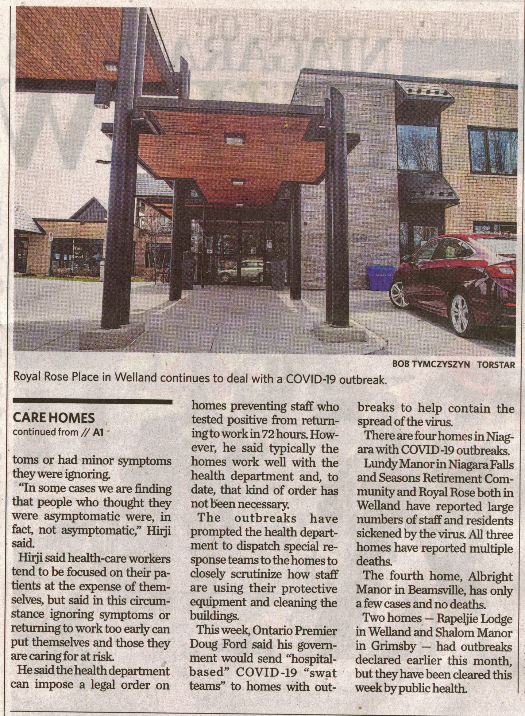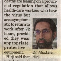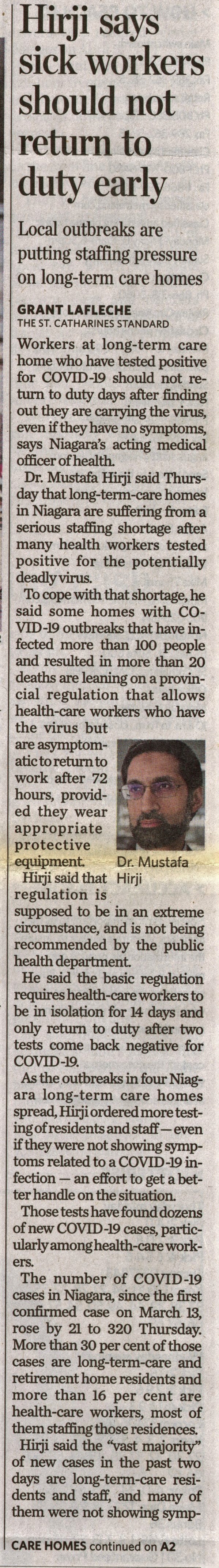 - Hirji says sick workers should not return to duty early : Local outbreaks are putting staffing pressure on long-term care homes