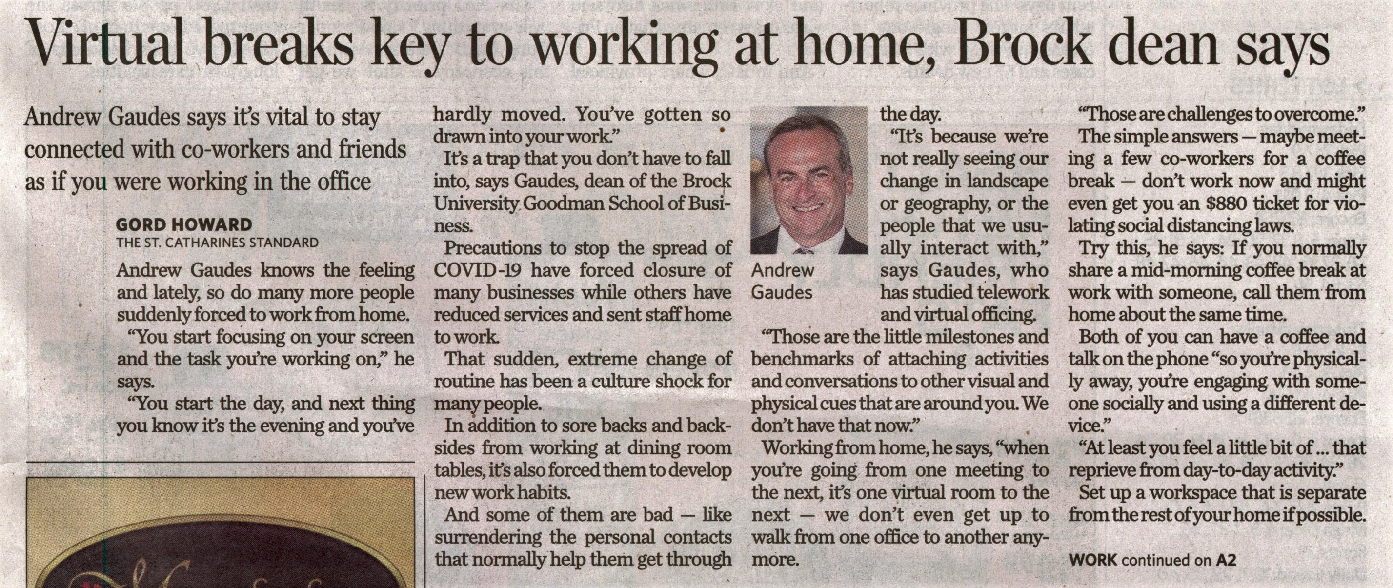 - Virtual breaks key to working at home, Brock dean says : Andrew Gaudes says it's vital to stay connected with co-workers and friends as if you were working in the office
