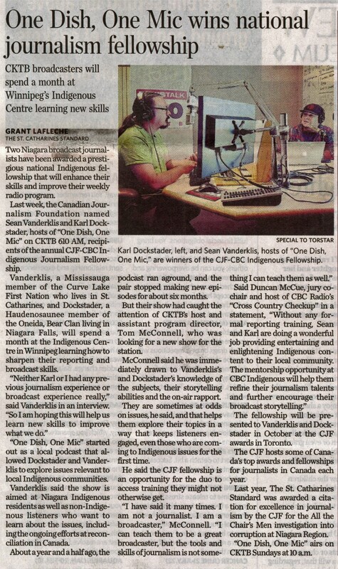 - One Dish, One Mic wins national journalism fellowship : CKTB broadcasters will spend a month at Winnipeg's Indigenous Centre learning new skills