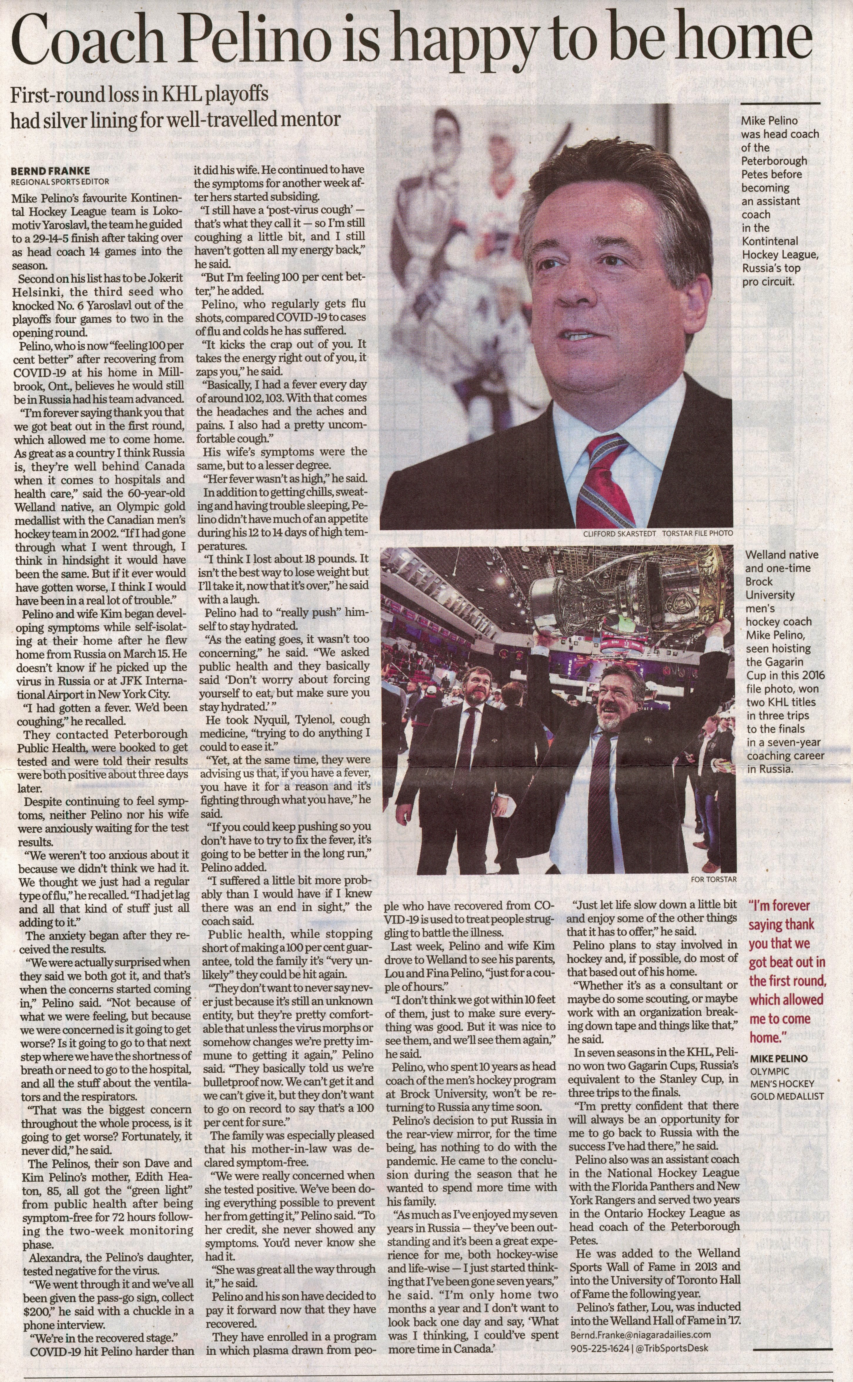 - Coach Pelino is happy to be home : First-round loss in KHL playoffs had silver lining for well-travelled mentor