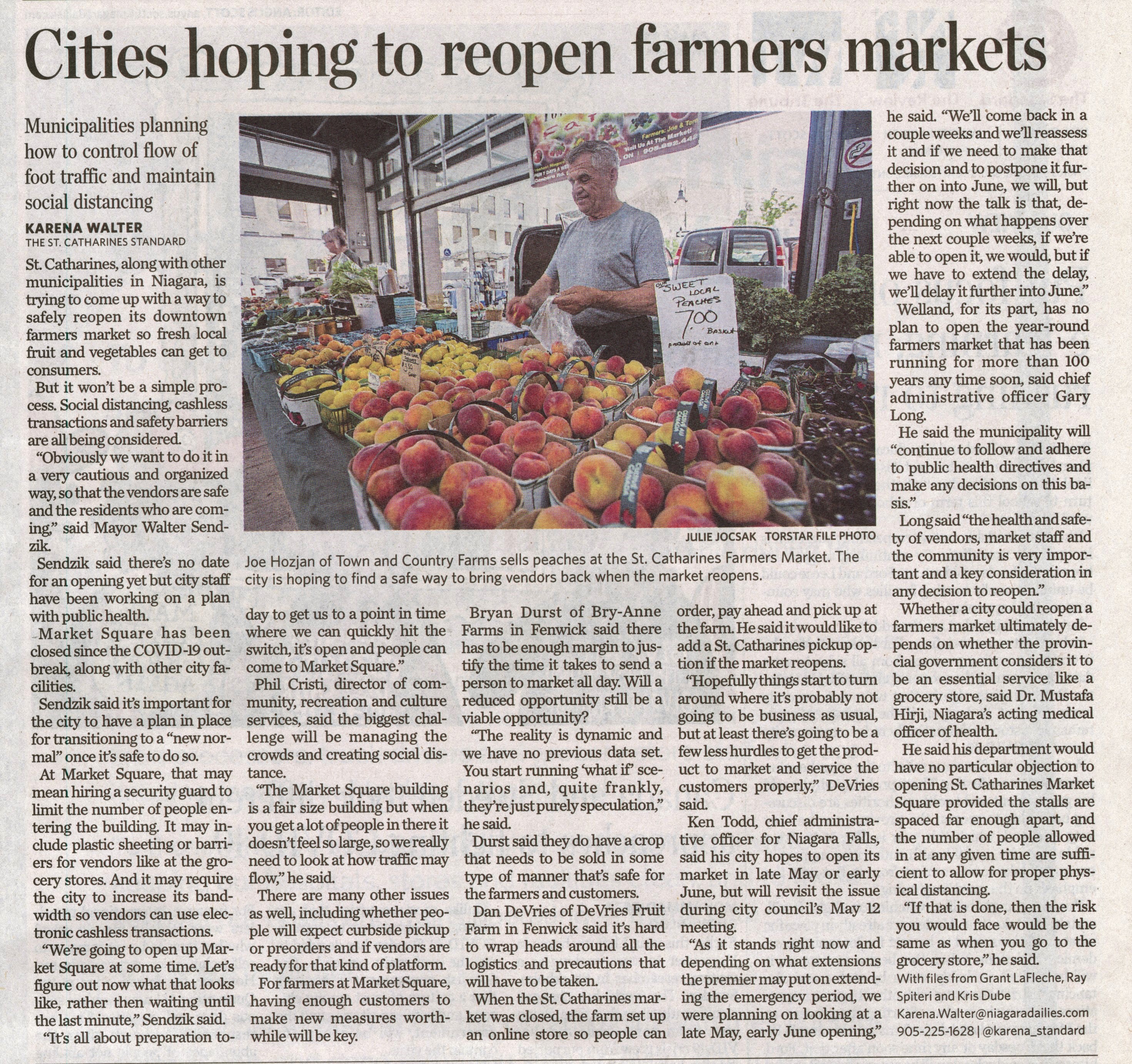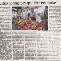 - Cities hoping to reopen farmers markets : Municipalities planning how to control flow of foot traffic and maintain social distancing