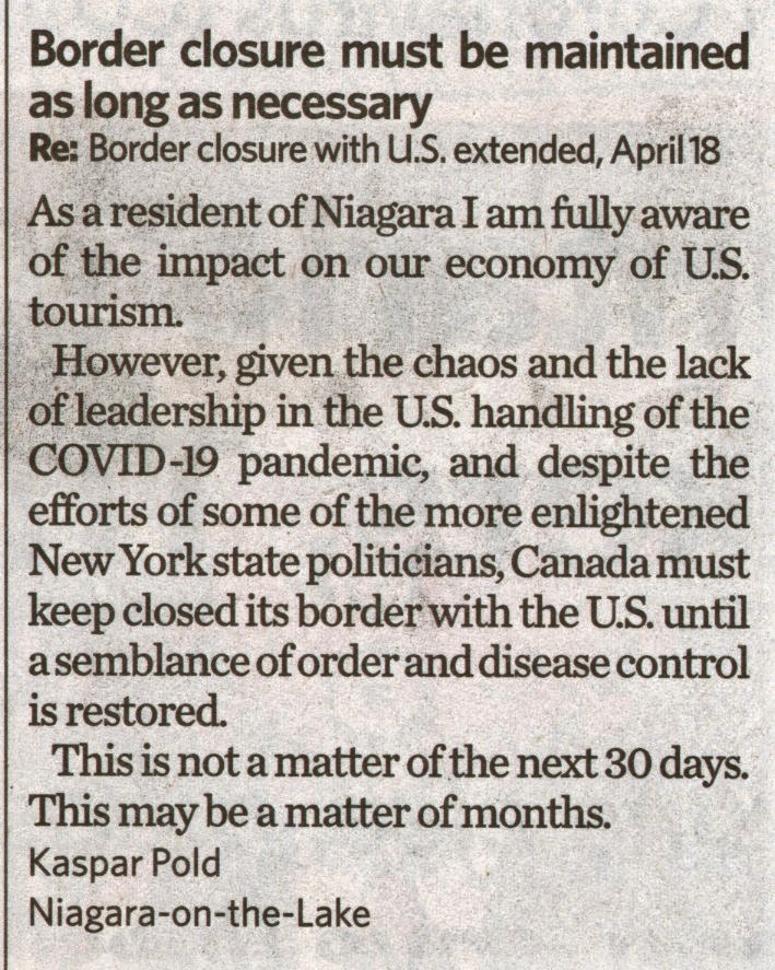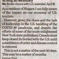 Border closure must be maintained as long as necessary Re: Border closure extended, April 18