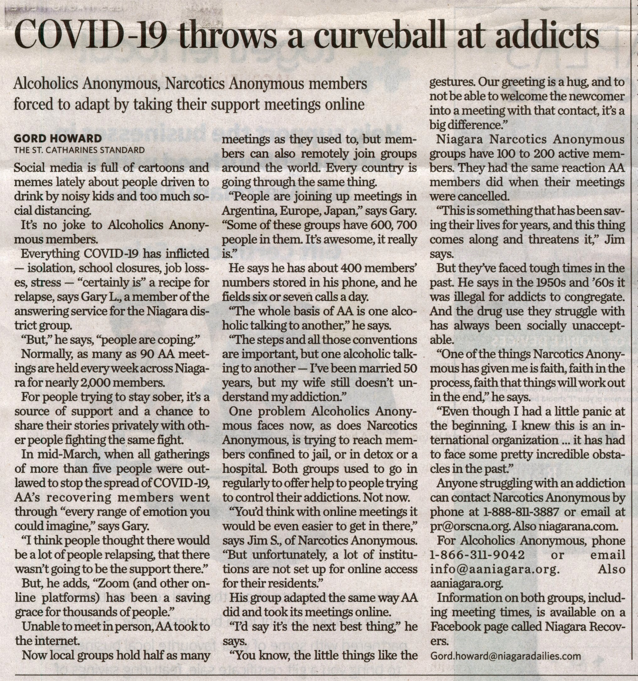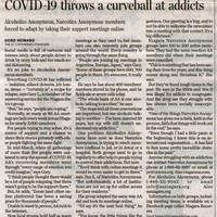- COVID-19 throws a curveball at addicts : Alcoholics Anonymous, Narcotics Anonymous members forced to adapt by taking their support meetings online
