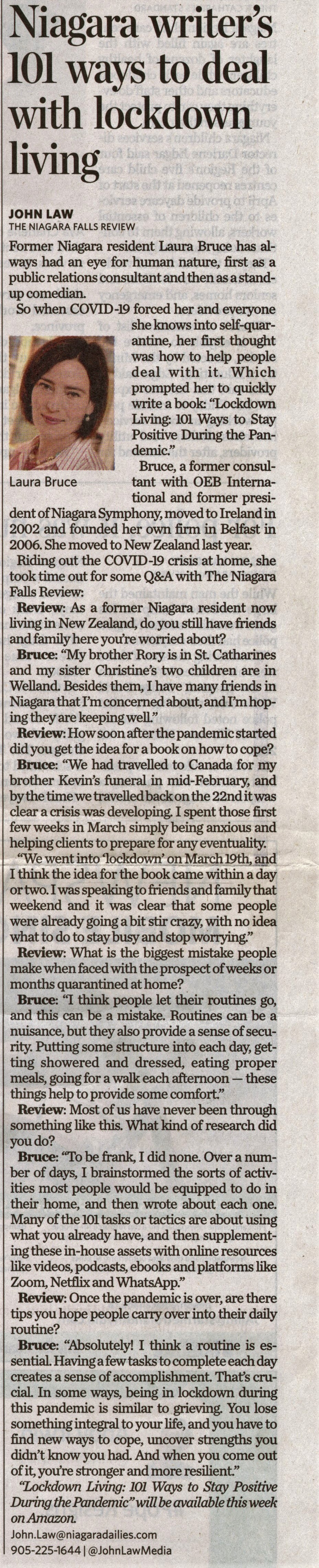 - Bruce, Laura / COVID-19 pandemic / author "Lockdown Living: 101 Ways to Stay Positive During the Pandemic"