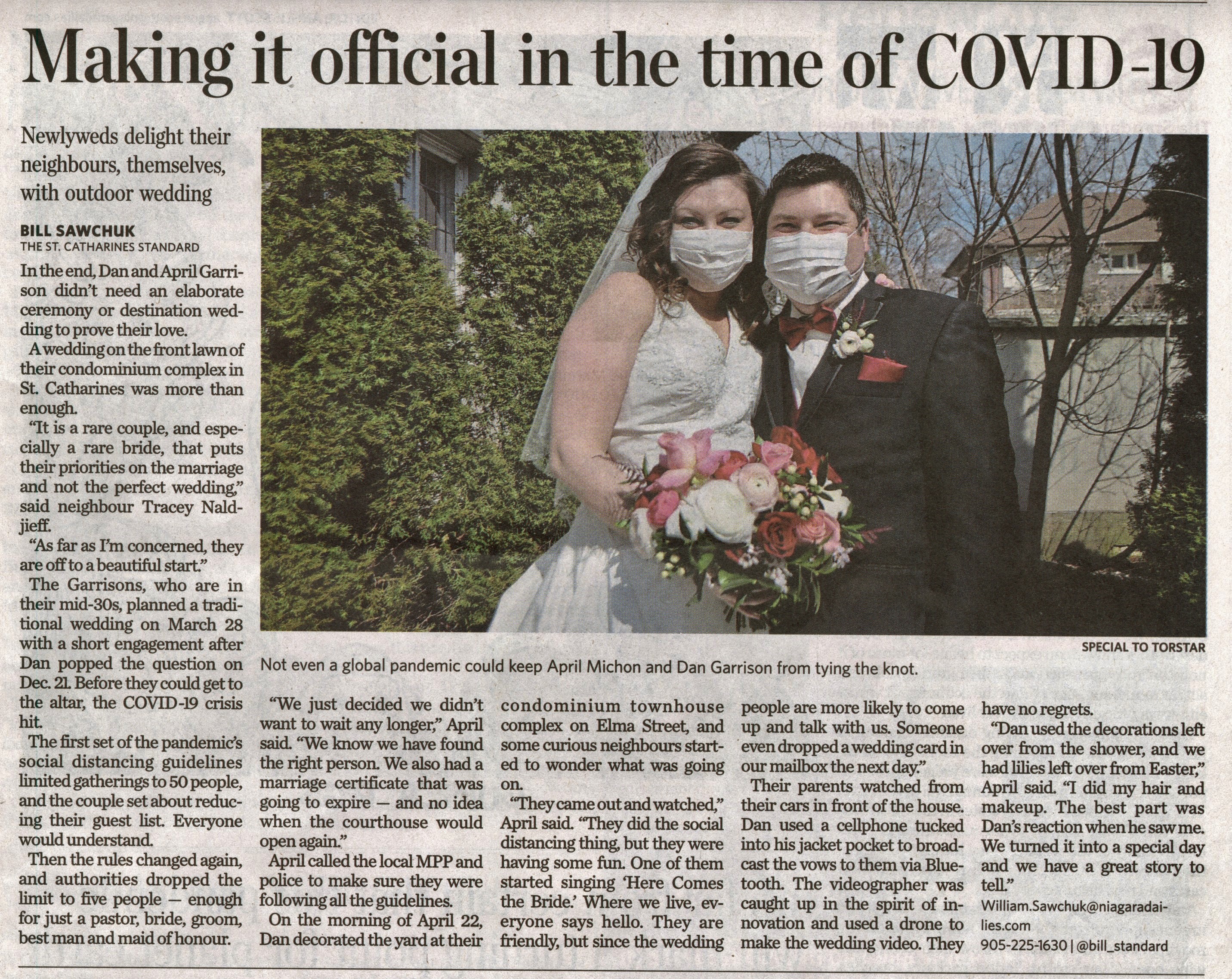 - Making it official in the time of COVID-19 : Newlyweds delight their neighbours, themselves with outdoor wedding