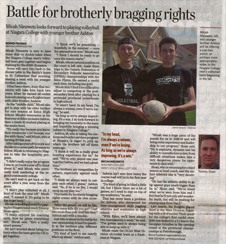 - Battle for brotherly bragging rights : Micah Nieuwets looks forward to playing volleyball at Niagara College with younger brother Ashton