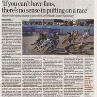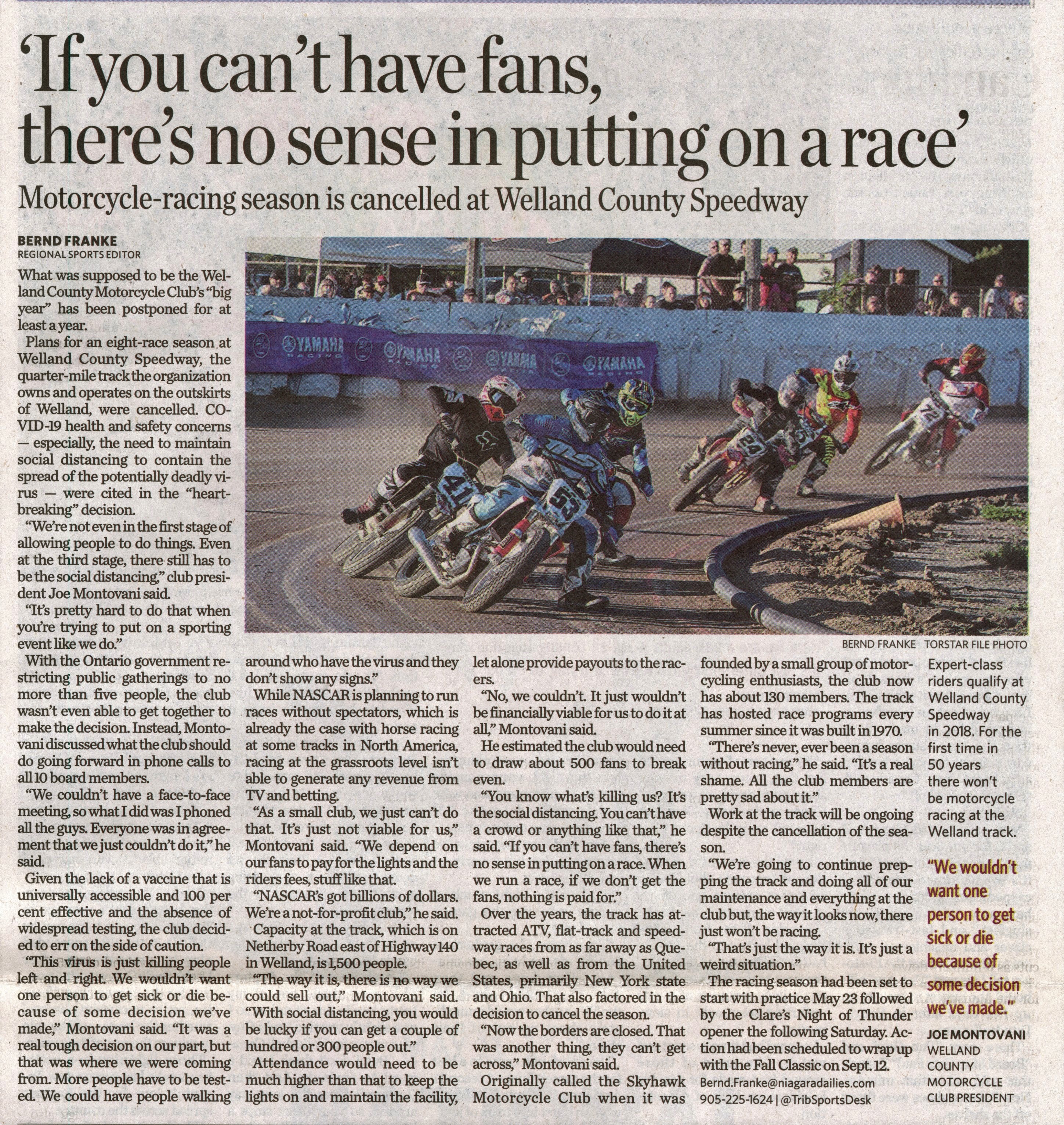 - 'If you can't have fans, there's no sense in putting on a race' : Motorcycle-racing season is cancelled at Welland County Speedway