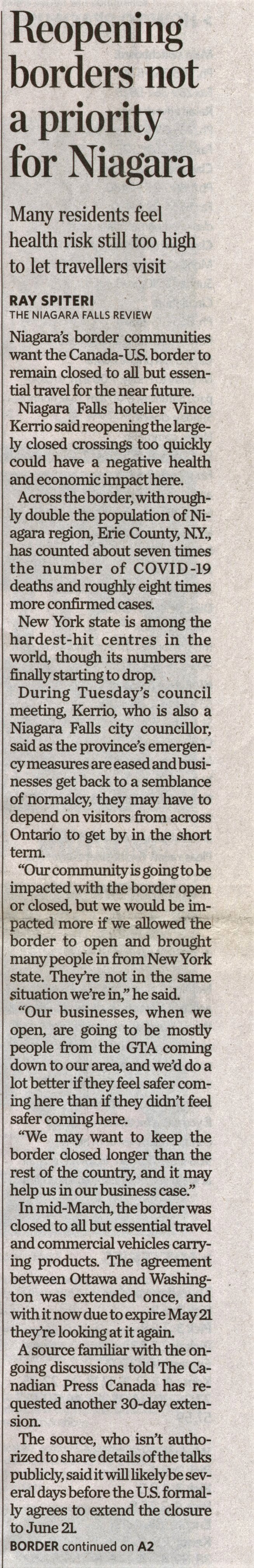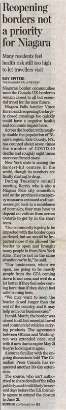 - Reopening borders not a priority for Niagara : many residents feel health risk still too high to let travellers visit