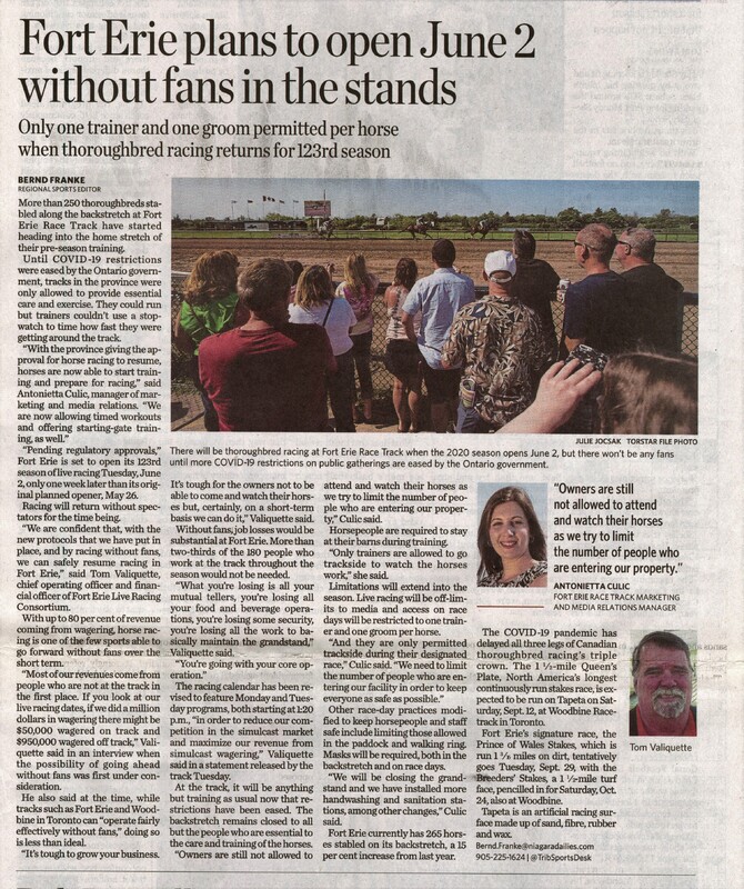 - Fort Erie plans to open June 2 without fans in the stands : Only one trainer and one groom permitted per horse when thoroughbred racing returns for 123rd season