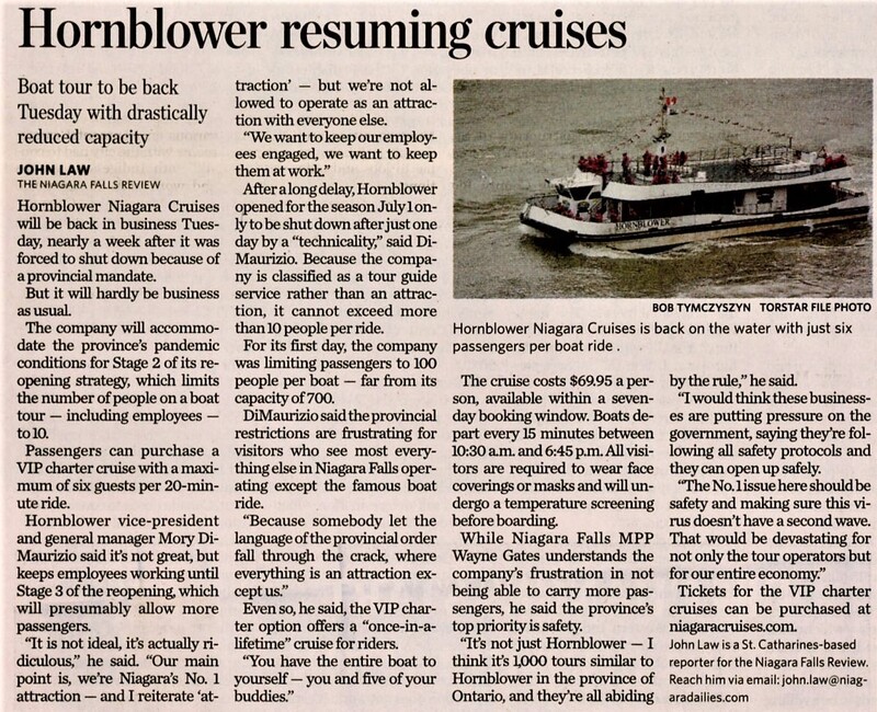 - Hornblower resuming cruises : boat tour to be back Tuesday with drastically reduced capacity