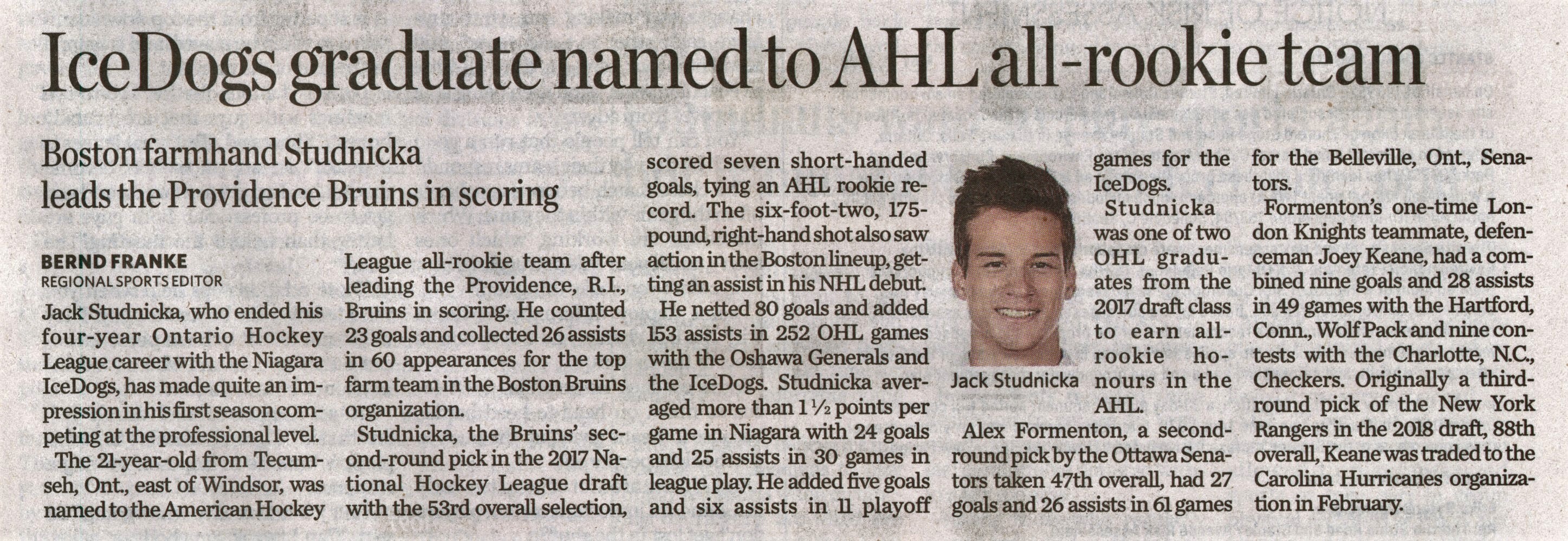 - IceDogs graduate named to AHL all-rookie team : Boston farmhand Studnicka leads the Providence Bruins in scoring