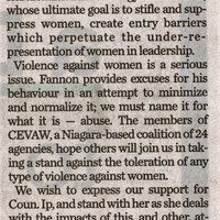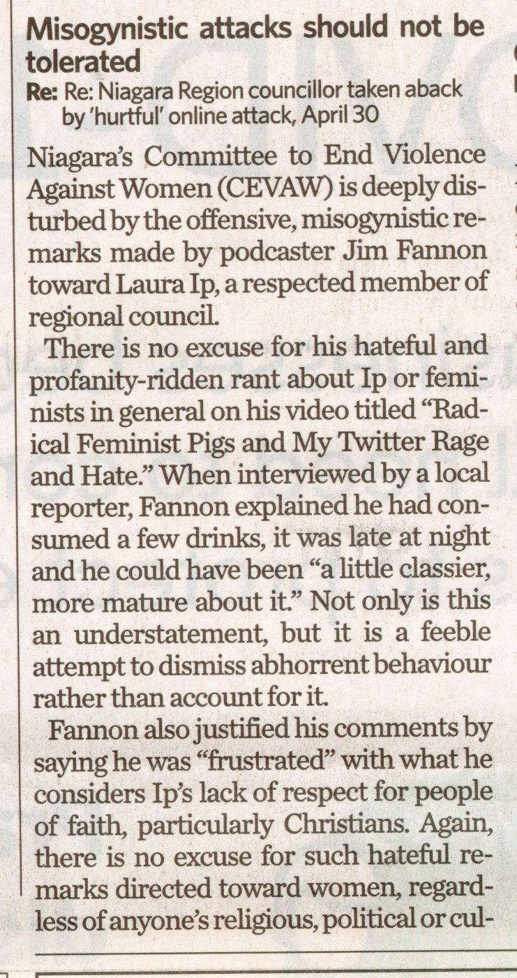 - Misogynistic attacks should not be tolerated : Re: Niagara Region councillor taken aback by 'hurtful' online attack', April 30