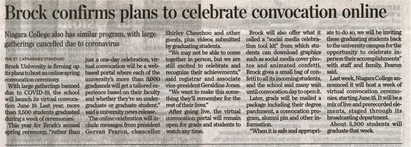 - Brock confirms plans to celebrate convocation online : Niagara College also has similar program, with large gatherings cancelled due to coronovirus