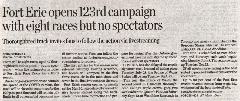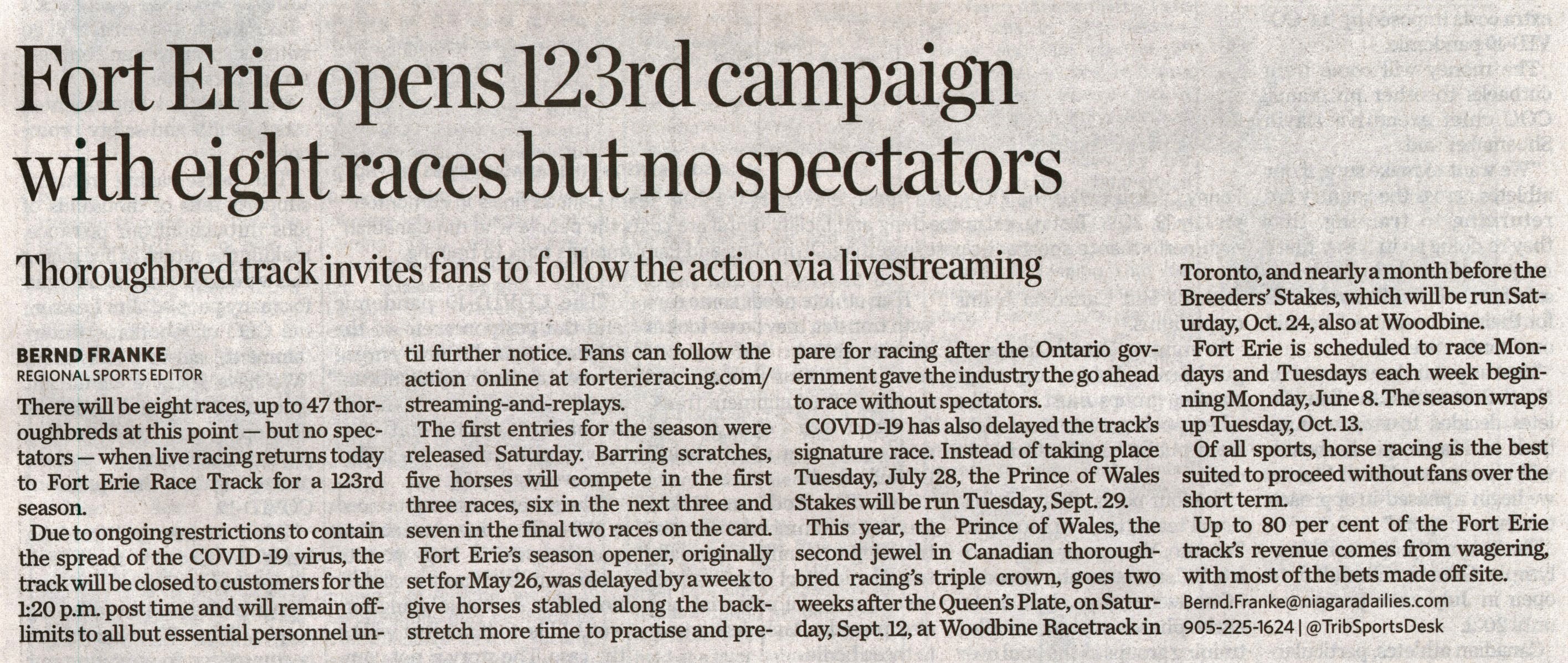 - Fort Erie opens 123rd campaign with eight races but no spectators : Thoroughbred track invites fans to follow the action via livestreaming
