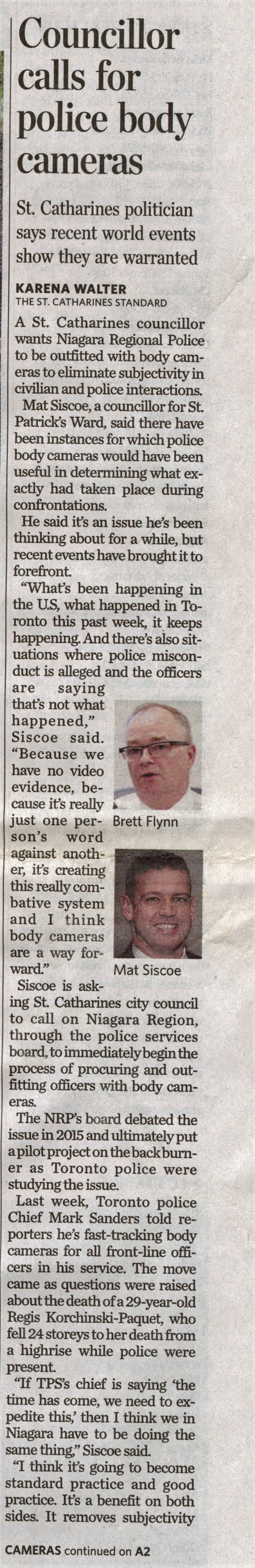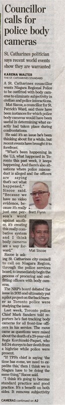 - Councillor calls for police body cameras : St. Catharines politician says recent world events show they are warranted