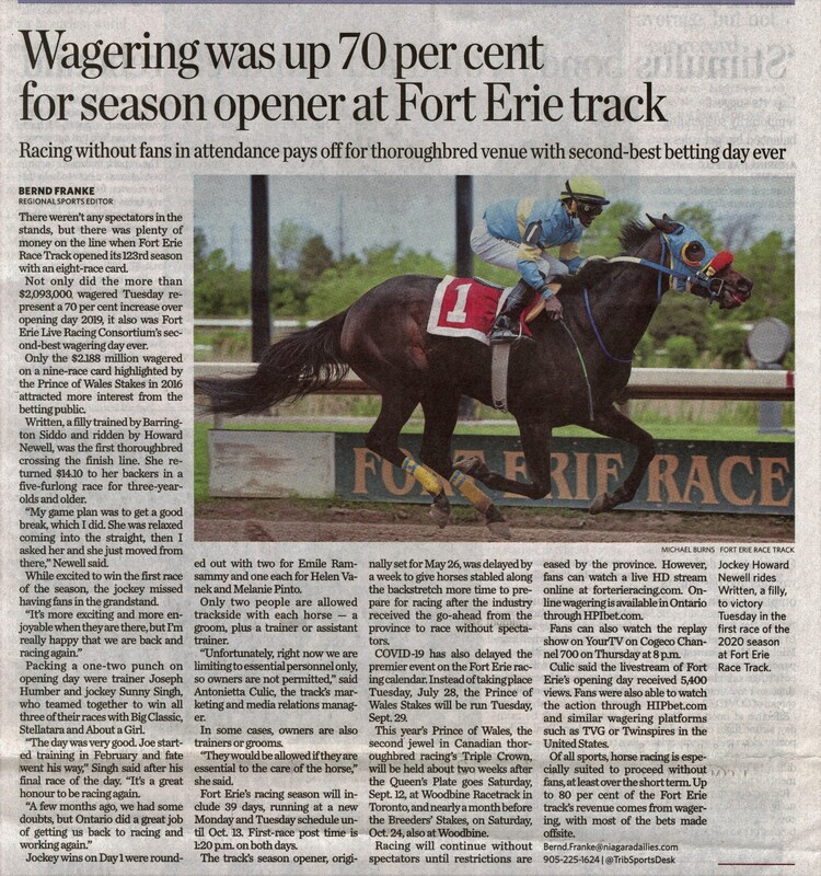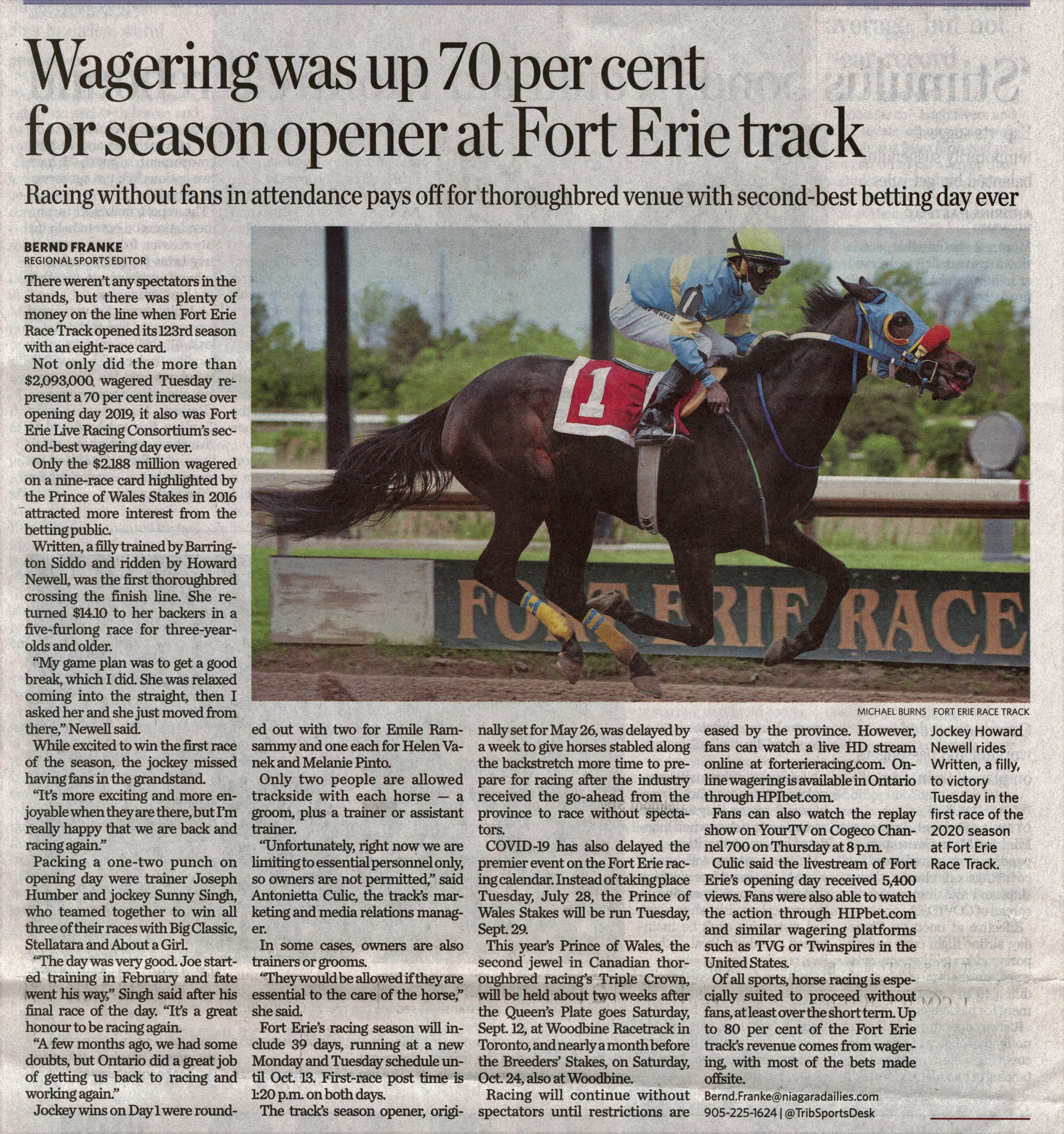 Wagering was up 70 per cent for season opener at Fort Erie track : Racing without fans in attendance pays off for thoroughbred venue with second-best betting day ever