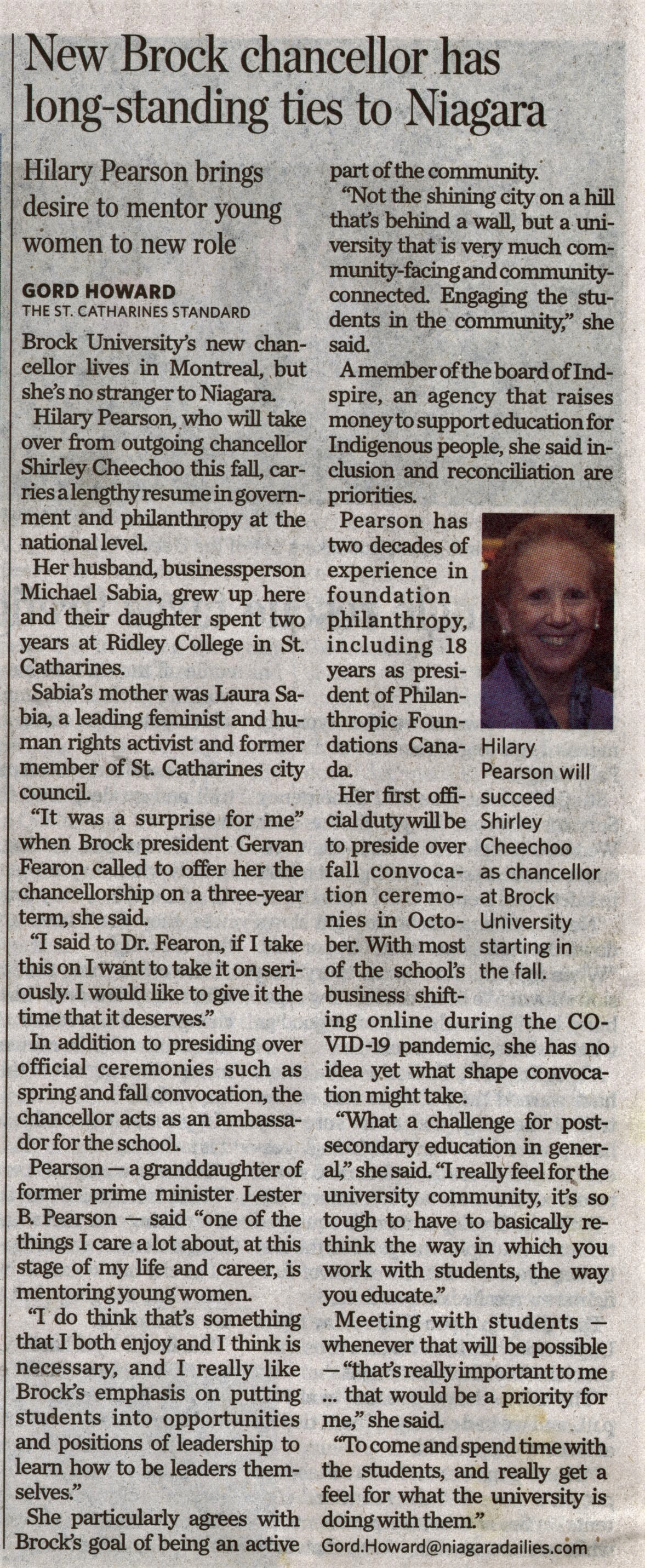 - New Brock chancellor has long -standing ties to Niagara : Hilary Pearson brings desire to mentor young women to new role