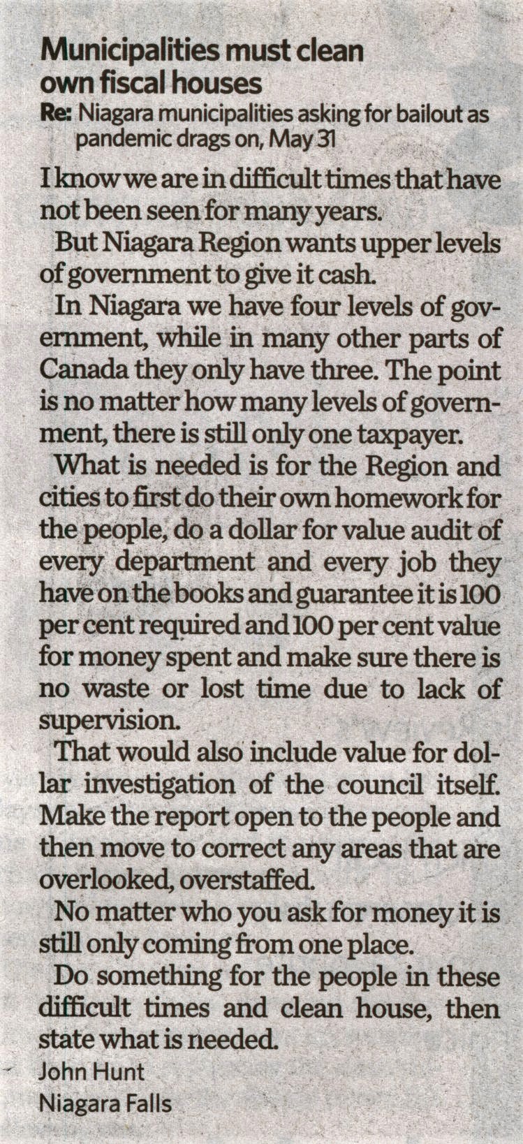 - Municipalities must clean own fiscal houses : Niagara municipalities asking for bailout as pandemic drags on