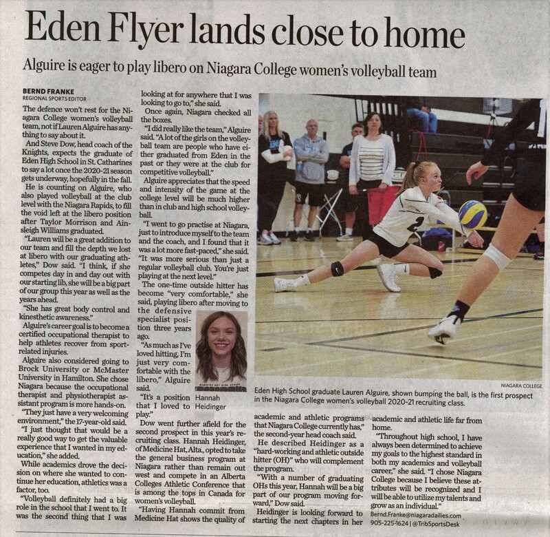 - Eden Flyer lands close to home : Alguire is eager to play libero on Niagara College women's volleyball team