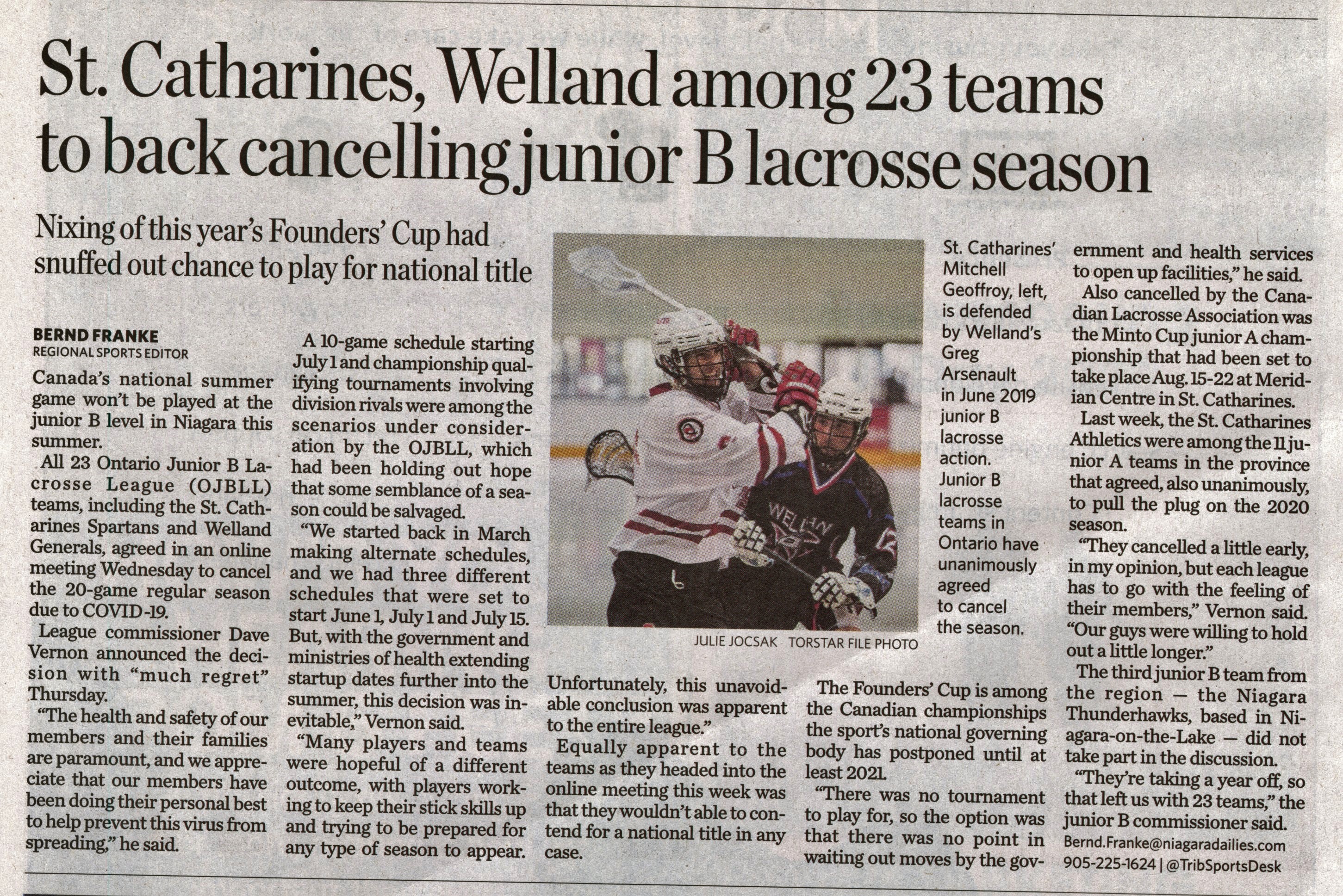 - St. Catharines, Welland among 23 teams to back cancelling junior B lacrosse season : Nixing of this year's Founders' Cup had snuffed out chance to play for national title