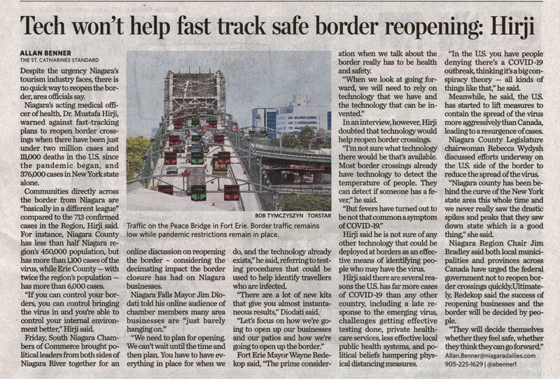 - Hirji, Mustafa Dr. / Niagara Tourism / COVID-19 pandemic / border reopening / Peace Bridge